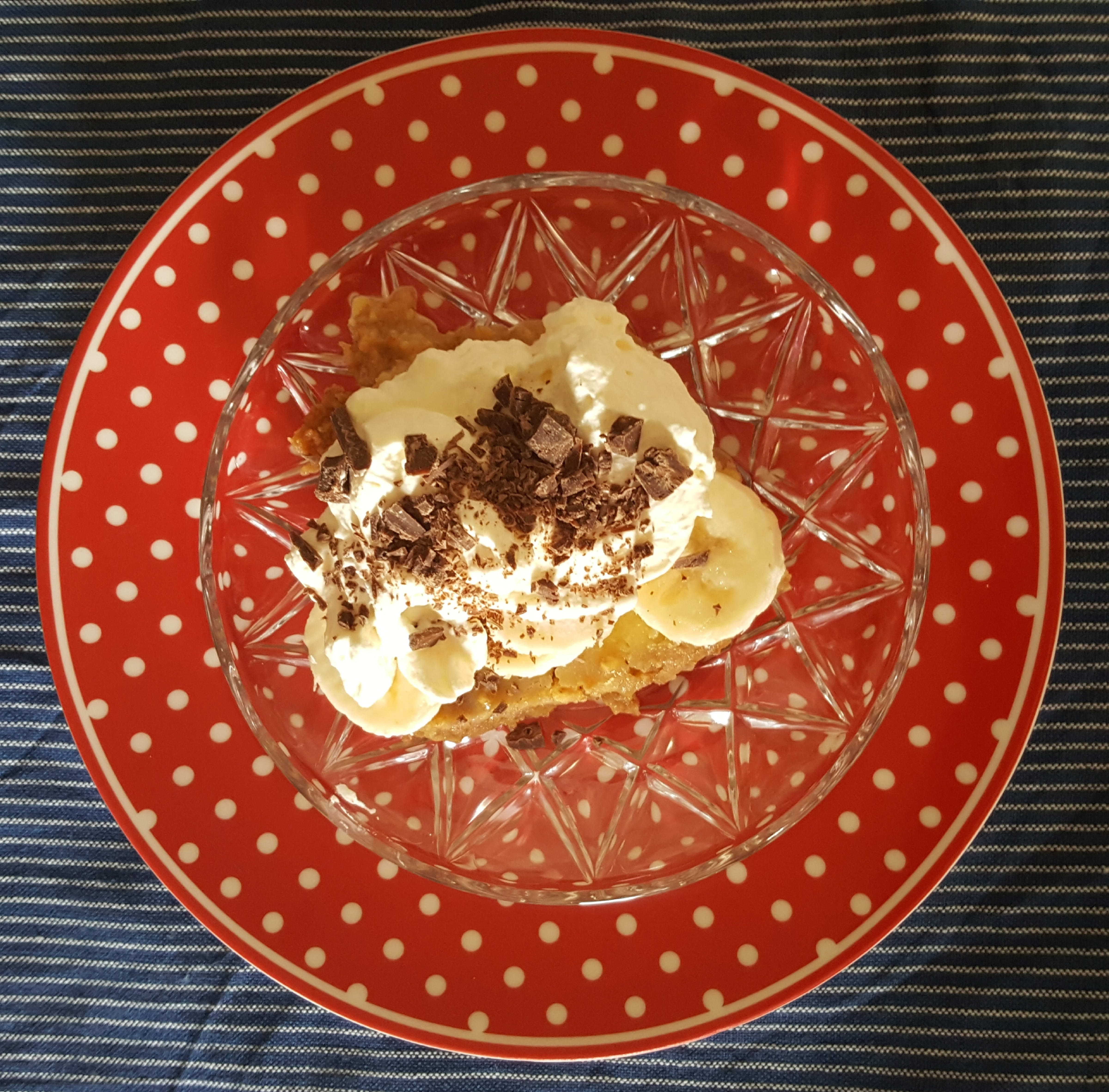 Avkjøl og hell over kjekksen. La kaken stå i kjøleskapet over natten. Del opp banenene og legg oppå kaken. Ha på et godt lag med krem som toppes med sjokoladespon.