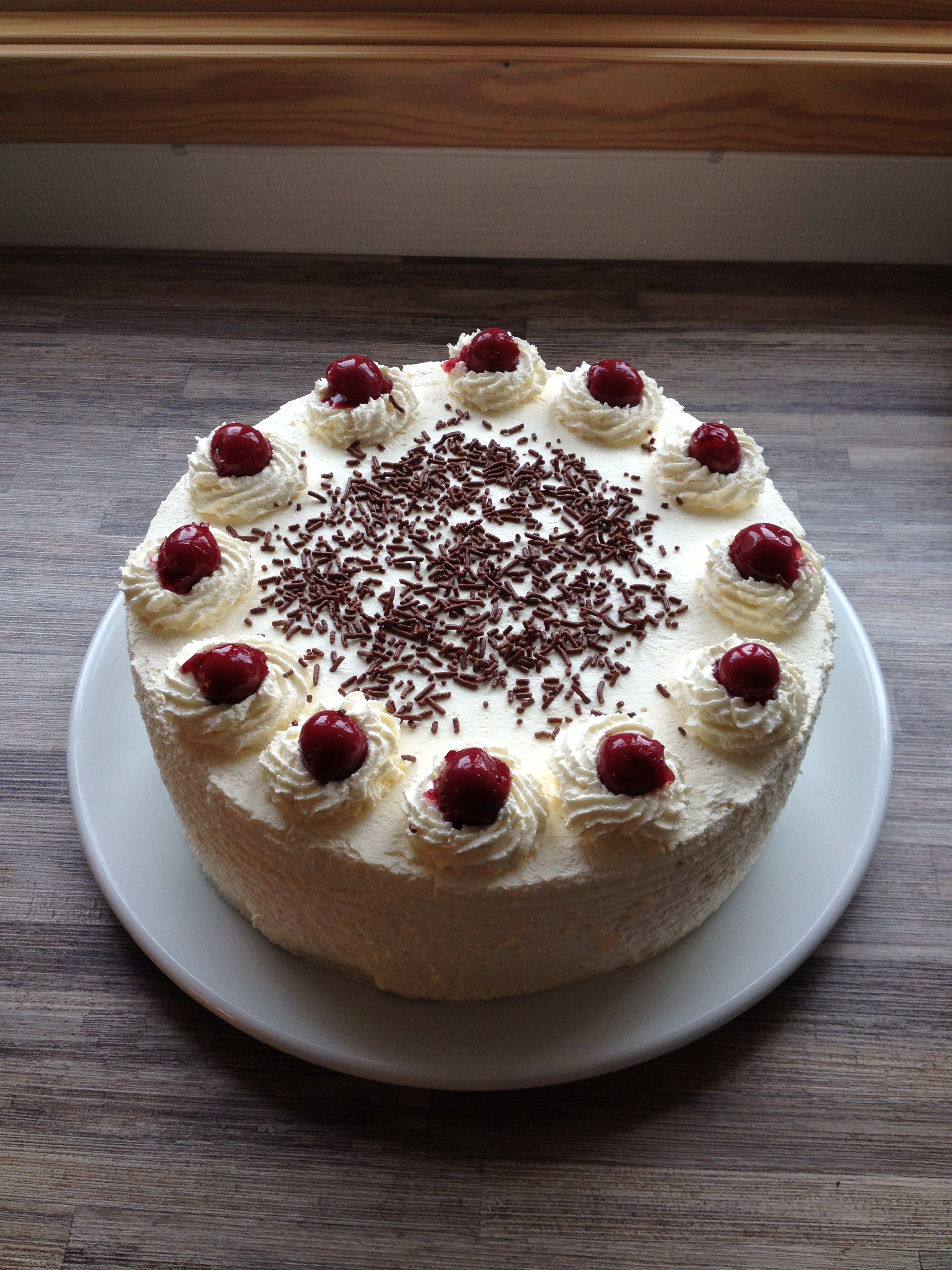 Stivpisk kremmen med sukker og vaniljesukkeret. Ha et lag på kirsebærene, så kakelag nr 2, mere krem og lag nr 3. Smør inn kaken med krem og pynt etter ønske.