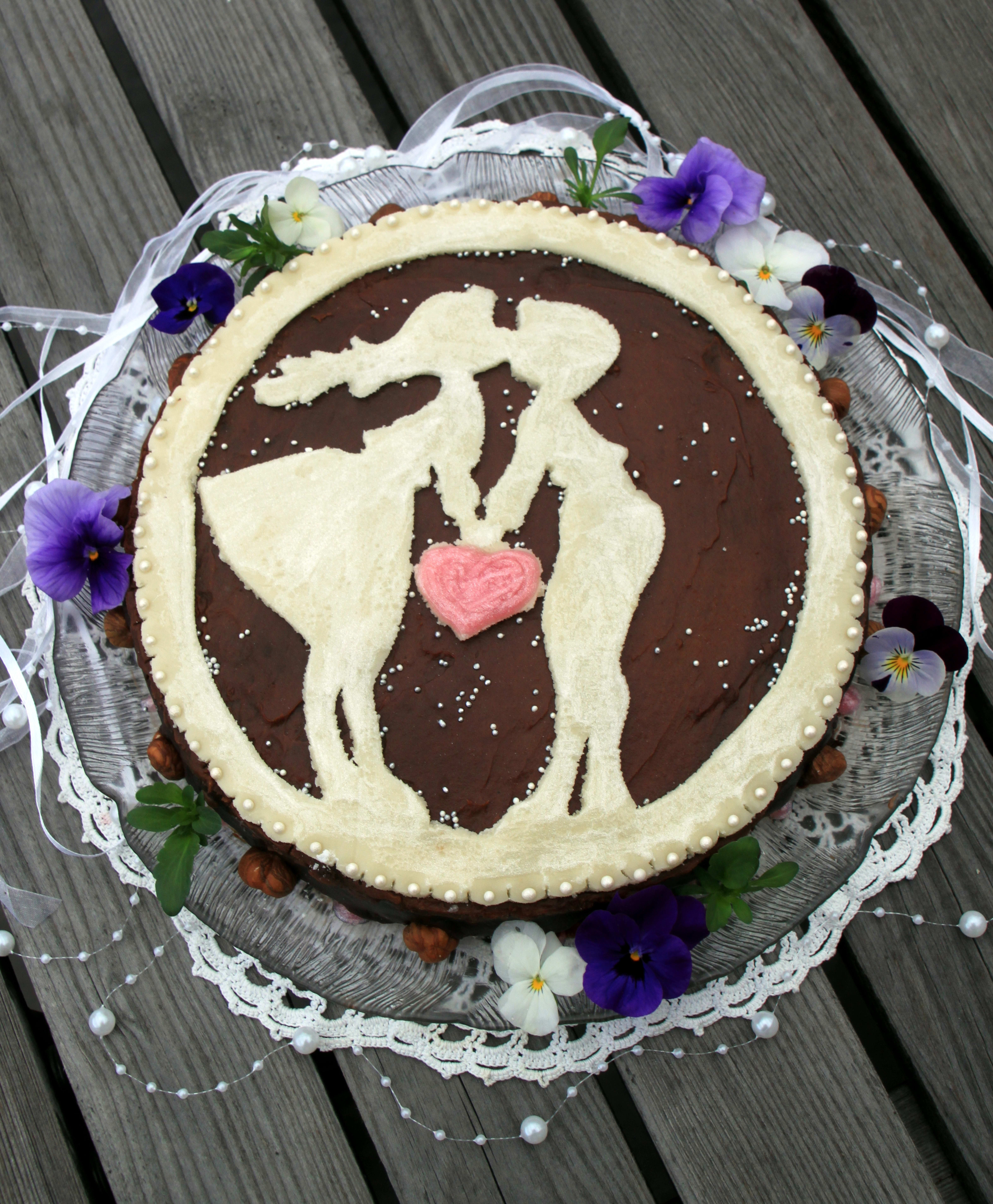 Smelt 75 g Bremykt til kremen og legg i biter av kokesjokolade. Rør inn siktet melis og et egg. Avkjøl kremen litt før den strykes på hele kaken. Sett kaken kaldt, gjerne natten over. Kjevle ut et stykke marsipan og lag figurer selv,, eller bruk pepperkakeformer til mann og kone og et hjerte.