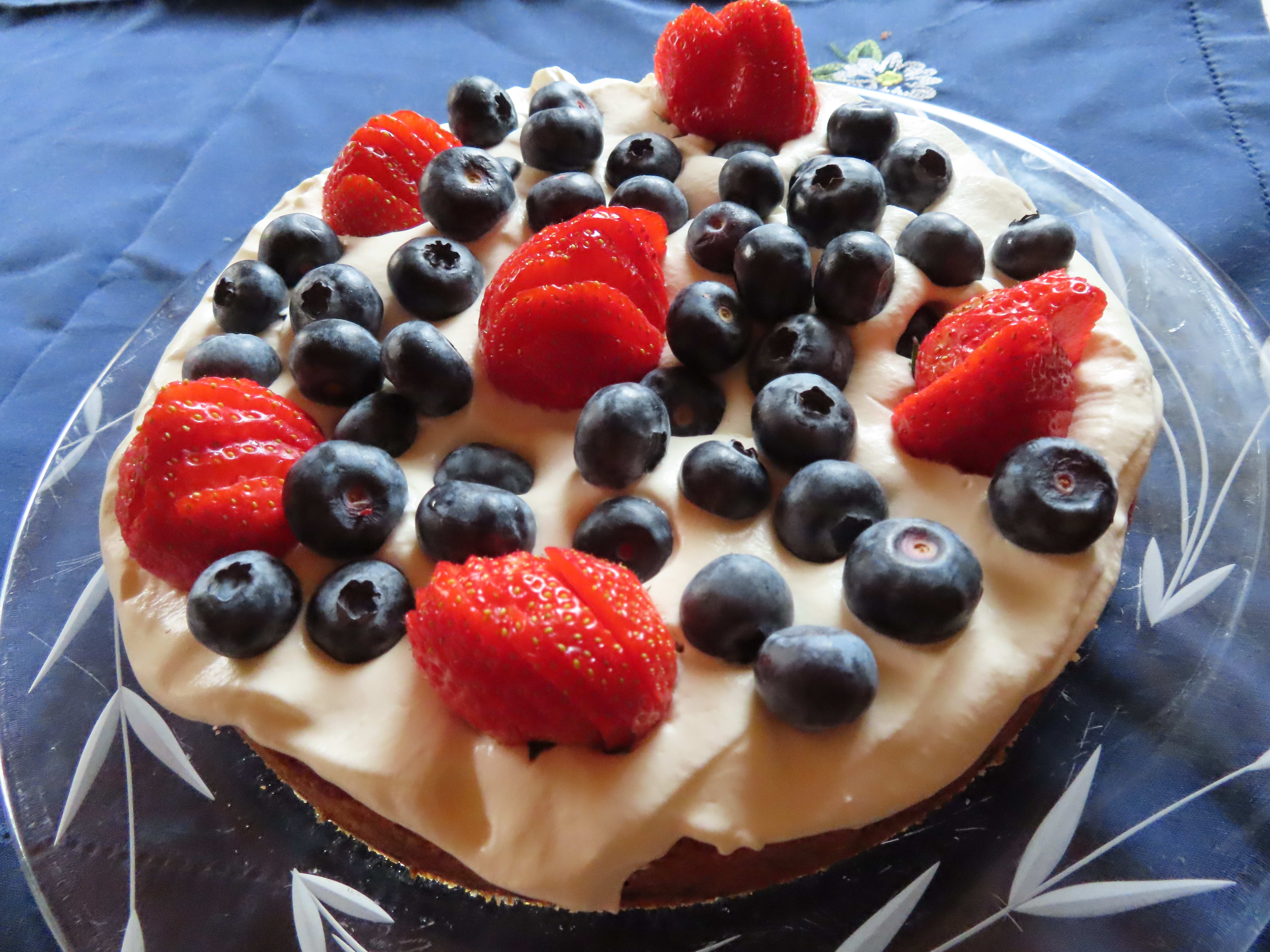 8. Legg kaka på eit rundt fat og pynt gjerne med krem og friske bær.