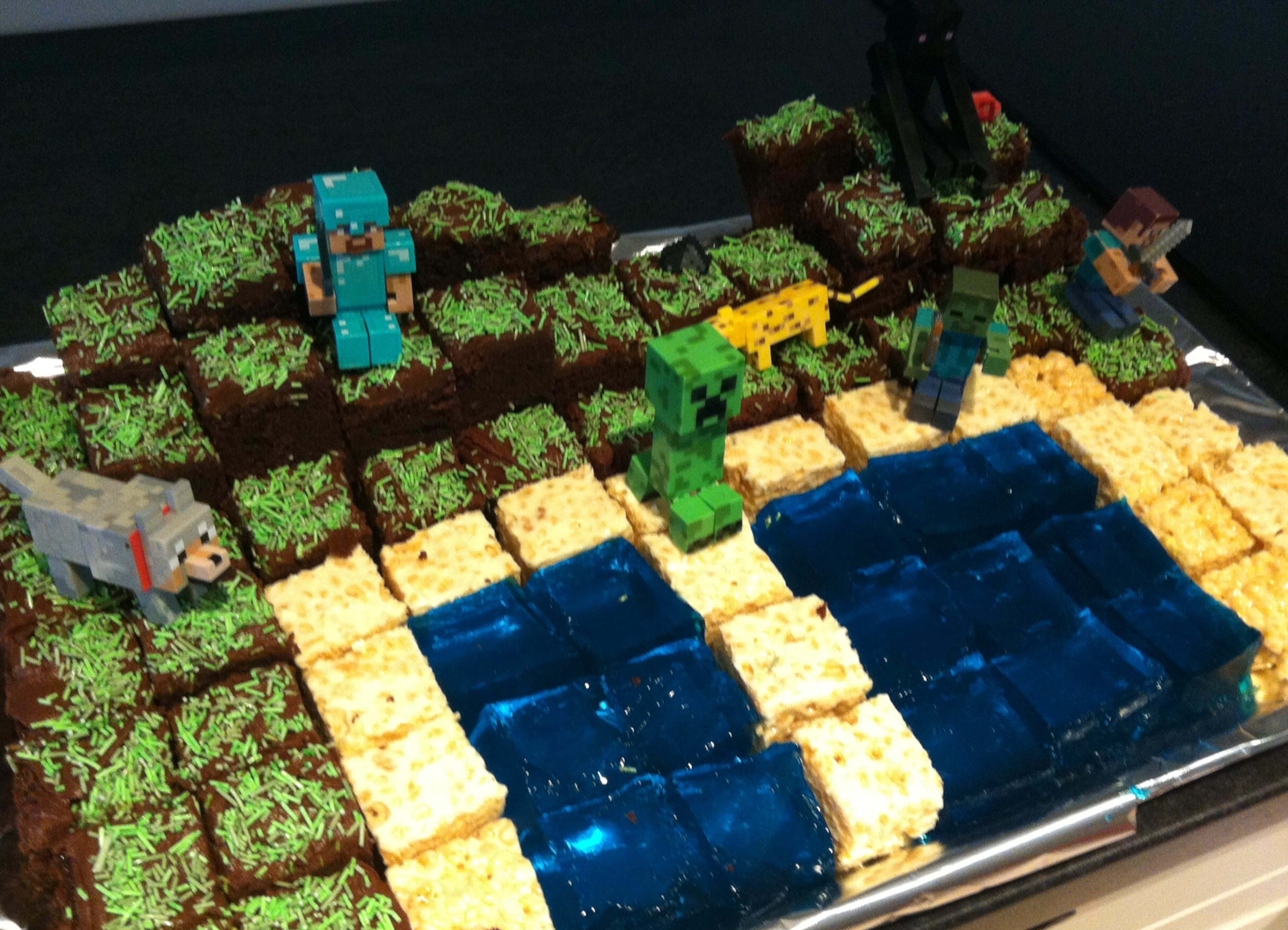 Plasser de forskjellige blokkene på et stort kakefat, bygg gjerne litt i høyden. Pynt med minecraftfigurer.
