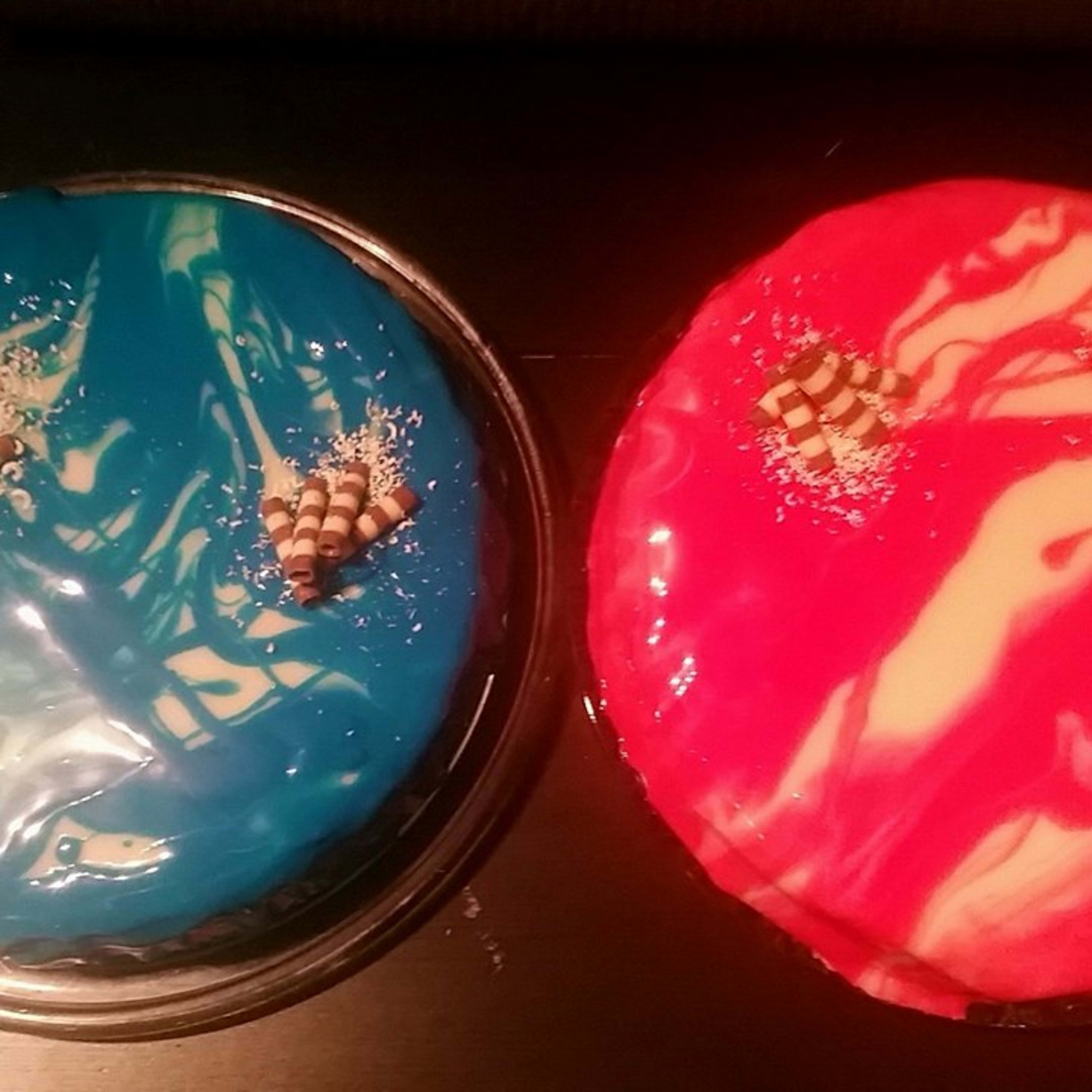 9.5. Start så med å helle litt og litt av glazen midt på kaken og la det sakte flyte utover av seg selv. Bruker du nå todelt farging, altså marmorering, heller du først på hovedfargen din.