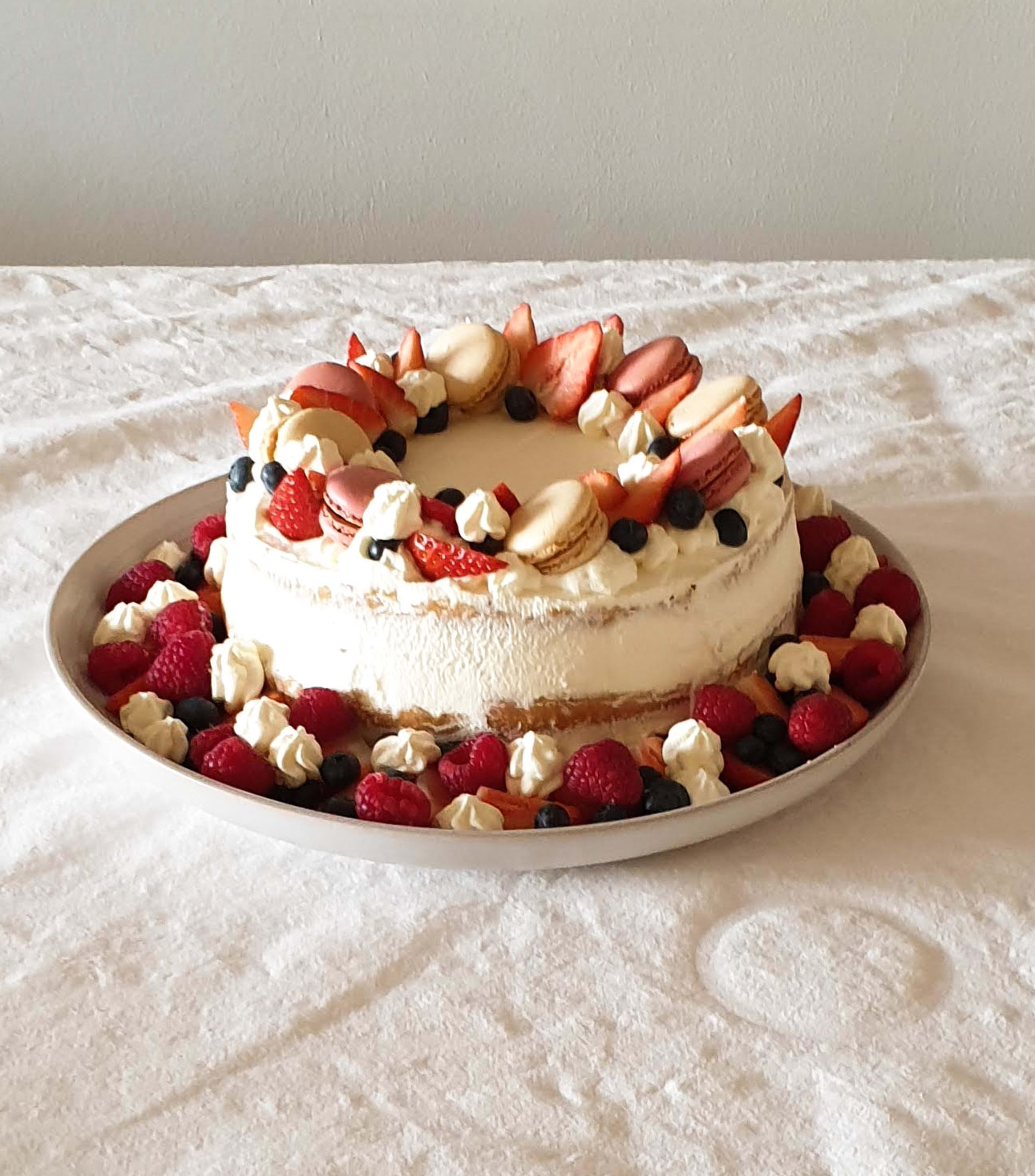 9. Smør et lag krem på toppen av kaken. Pynt med marengs, makroner og hakkede bær oppå kaken. Pynt gjerne også med bær og marengs rundt bunnen av kaken.