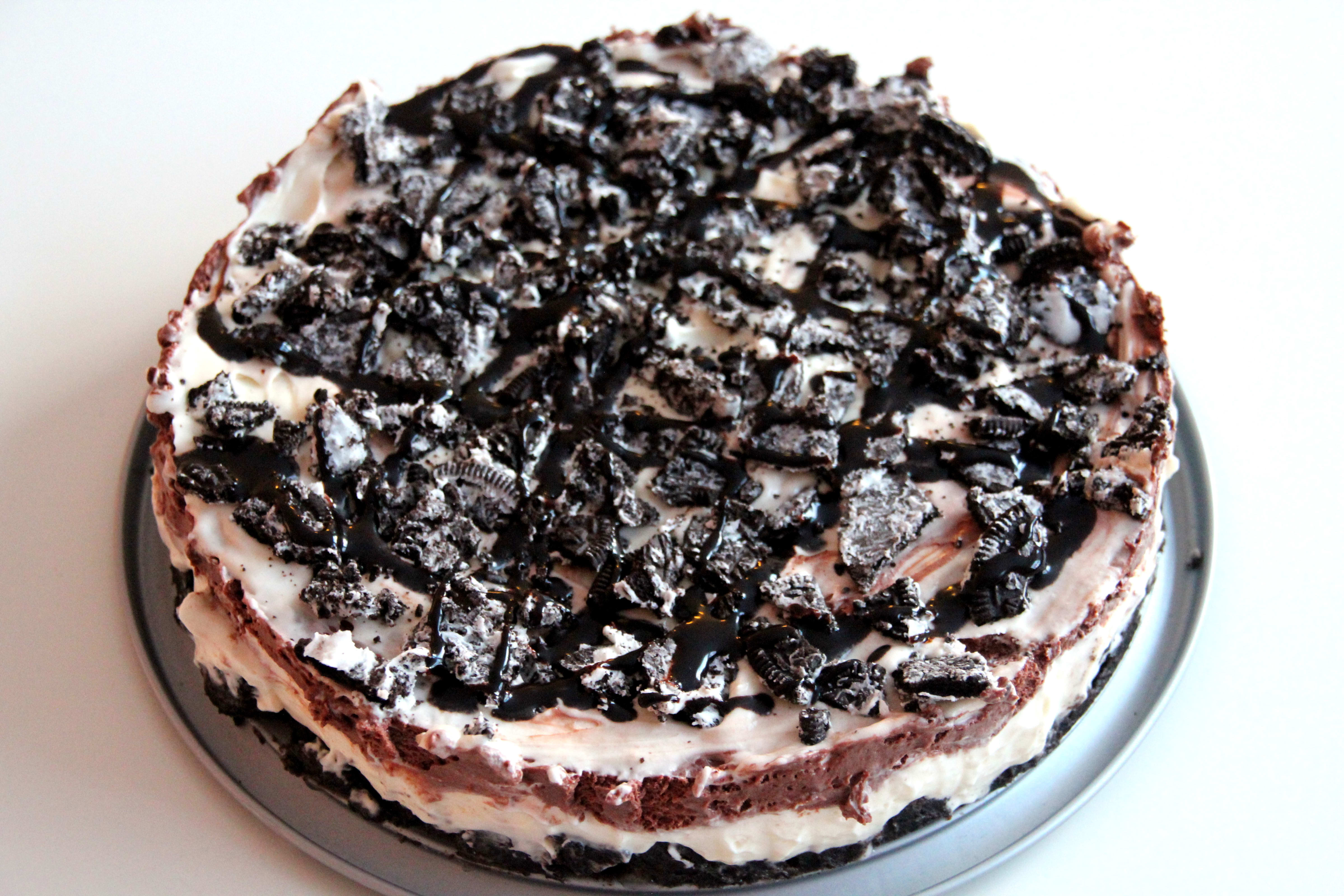 Pisk sammen melk og sjokolademousse til det blir en mousse, bre den over kaken og sett inn i kjøleskapet igjen. Knus resten av oreokjeksene og strø omkring på toppen - avslutt med en haug sjokoladesaus og sett inn i kjøleskapet til den skal nytes -