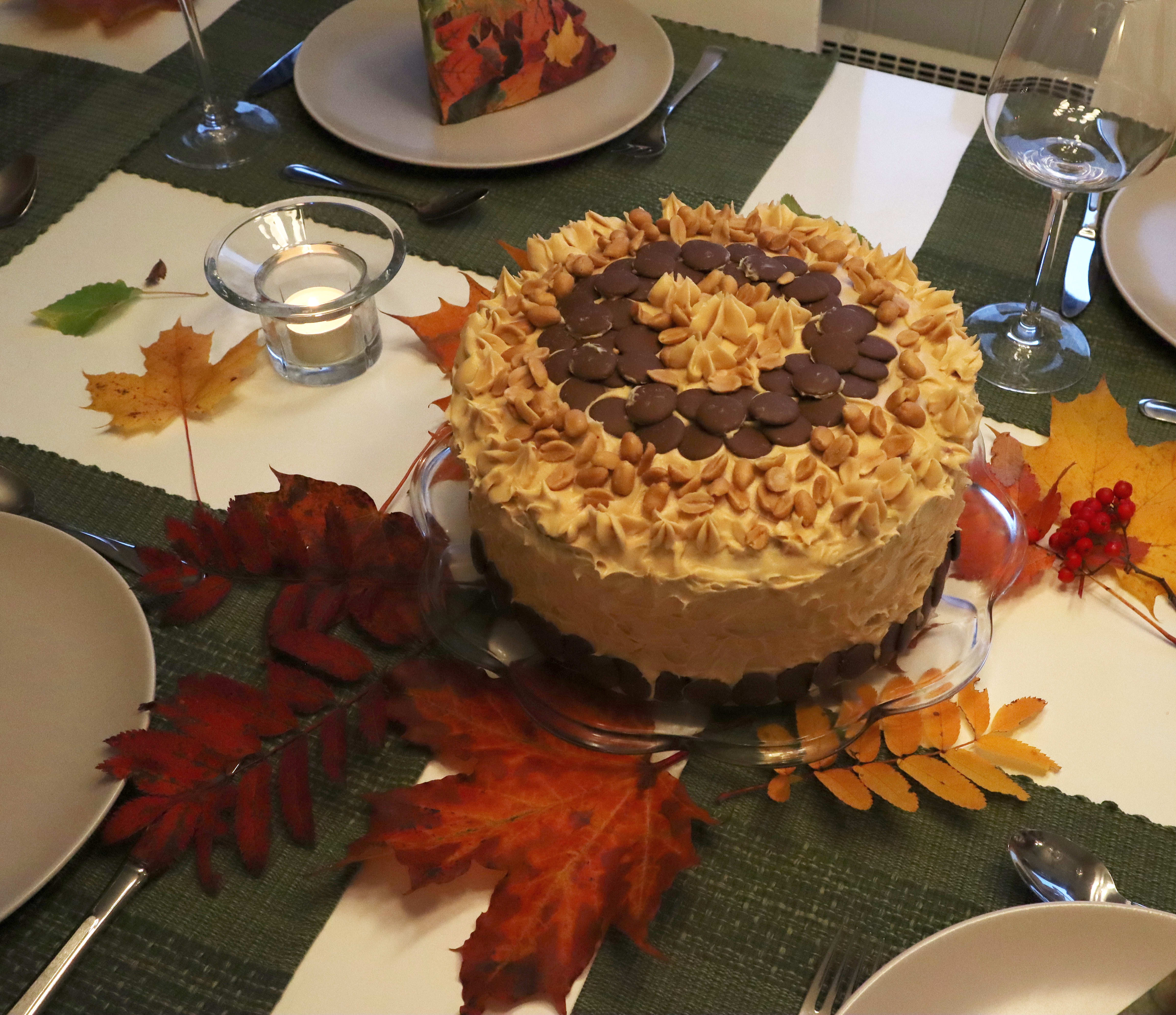11. Del hver kake i midten slik at du får fire lag. Fyll hvert lag med karamellkrem og drøss over et jevnt lag med peanøtter.