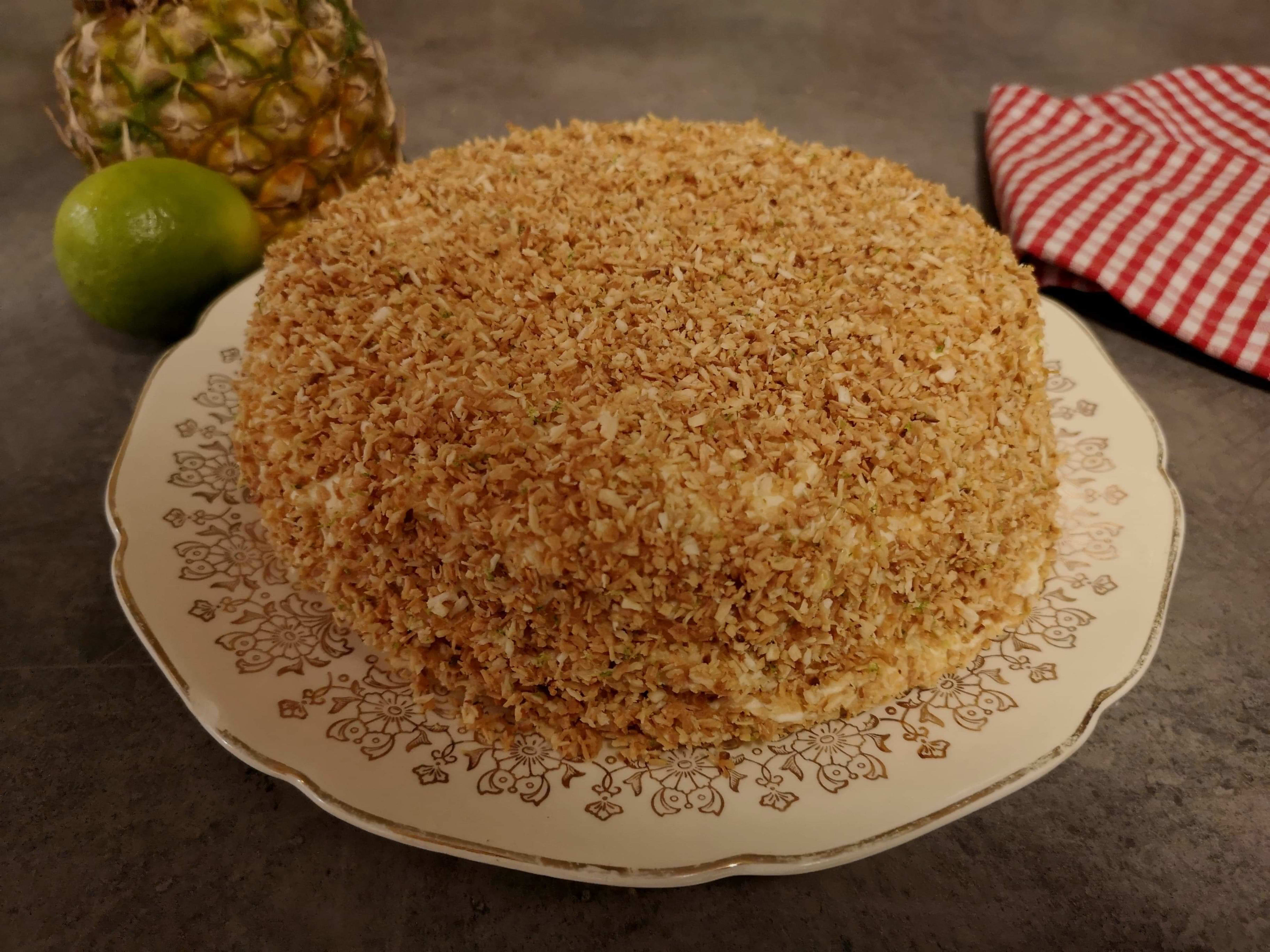 16: Skjær sukkerbrødet i tre. Ha et tynt lag kokossmørkrem på den ene bunnen, og dekk med halvparten av ananasen. Ha så på halvparten av limekremen. Gjenta med neste lag kake. Dekk med det siste laget med sukkerbrødet, og smør opp kaken med resten av kokossmørkremen. Ha rikelig med ristet kokos på sidene og på toppen - press gjerne på med hendene. Serveres avkjølt.