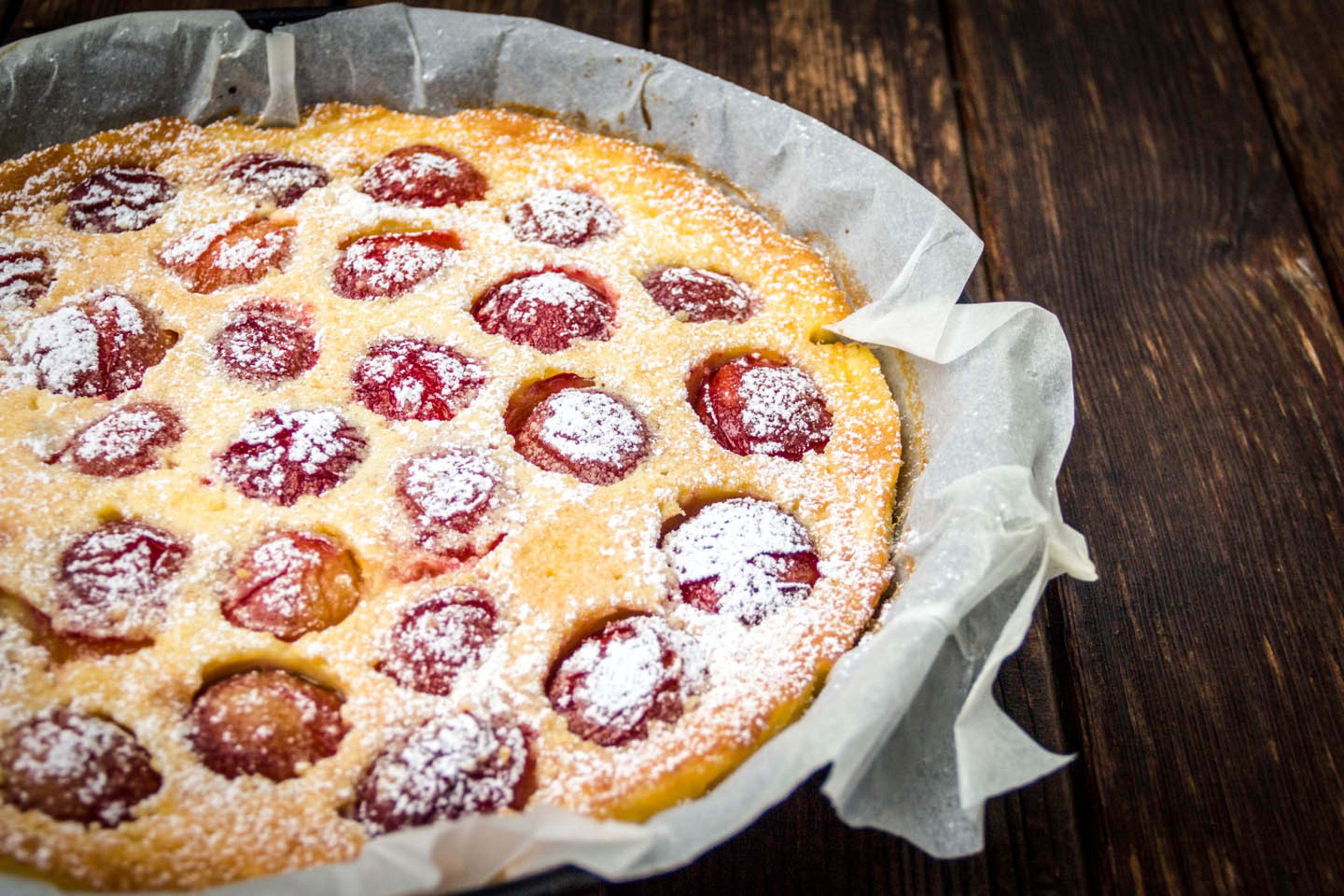 4)Vi dekket en mold av 21 cm med bakepapir, og vi er på vei plassere plommer.