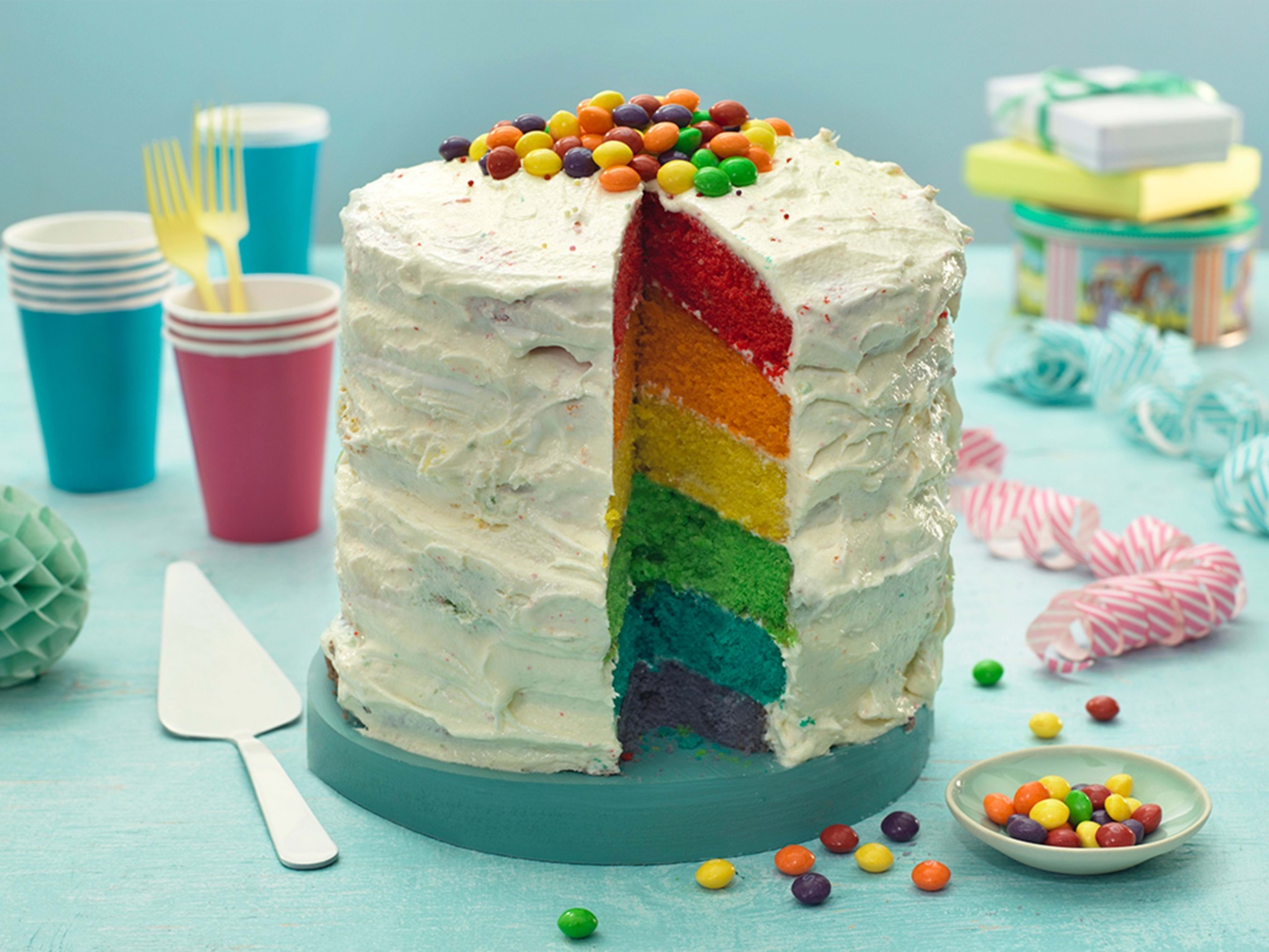 Fordel røra i 6 boller (bruk gjerne en vekt så du får lik mengde) og tilsett litt farge i hver. Bland godt sammen og ha i smurte former. Stekes på midterste rille ca. 20 minutter, sjekk med en kakepinne at bunnene er ferdig. Det skal ikke sitte igjen deig. Avkjøl litt i forma og vend bunnene over på rist.
