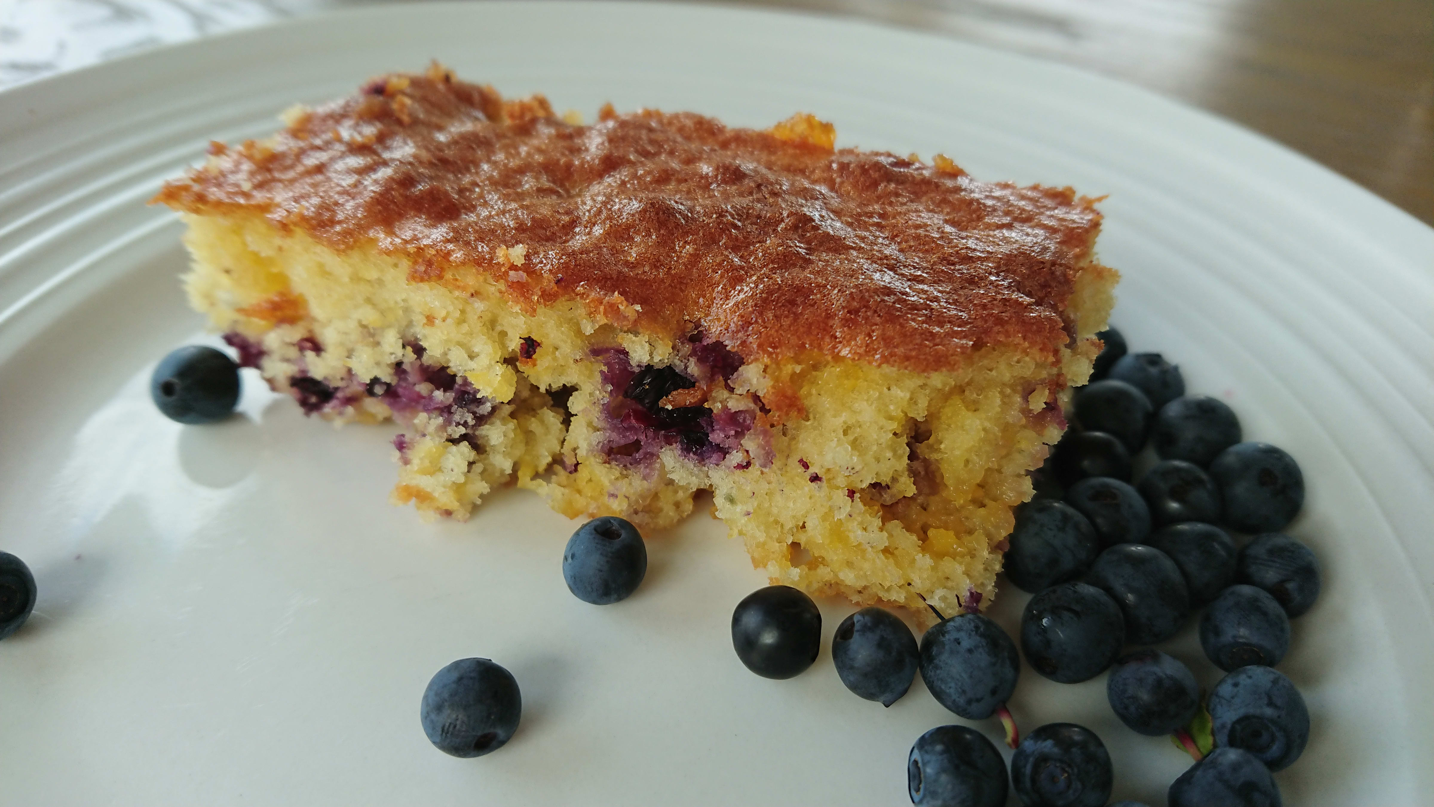 Rør smør og sukker hvitt. Rør inn ett egg av gangen. Bland det tørre og sikt inn. Rør inn melken. Rasp marsipanen grovt på et råkostjern og vend inn. Vend inn blåbærene.