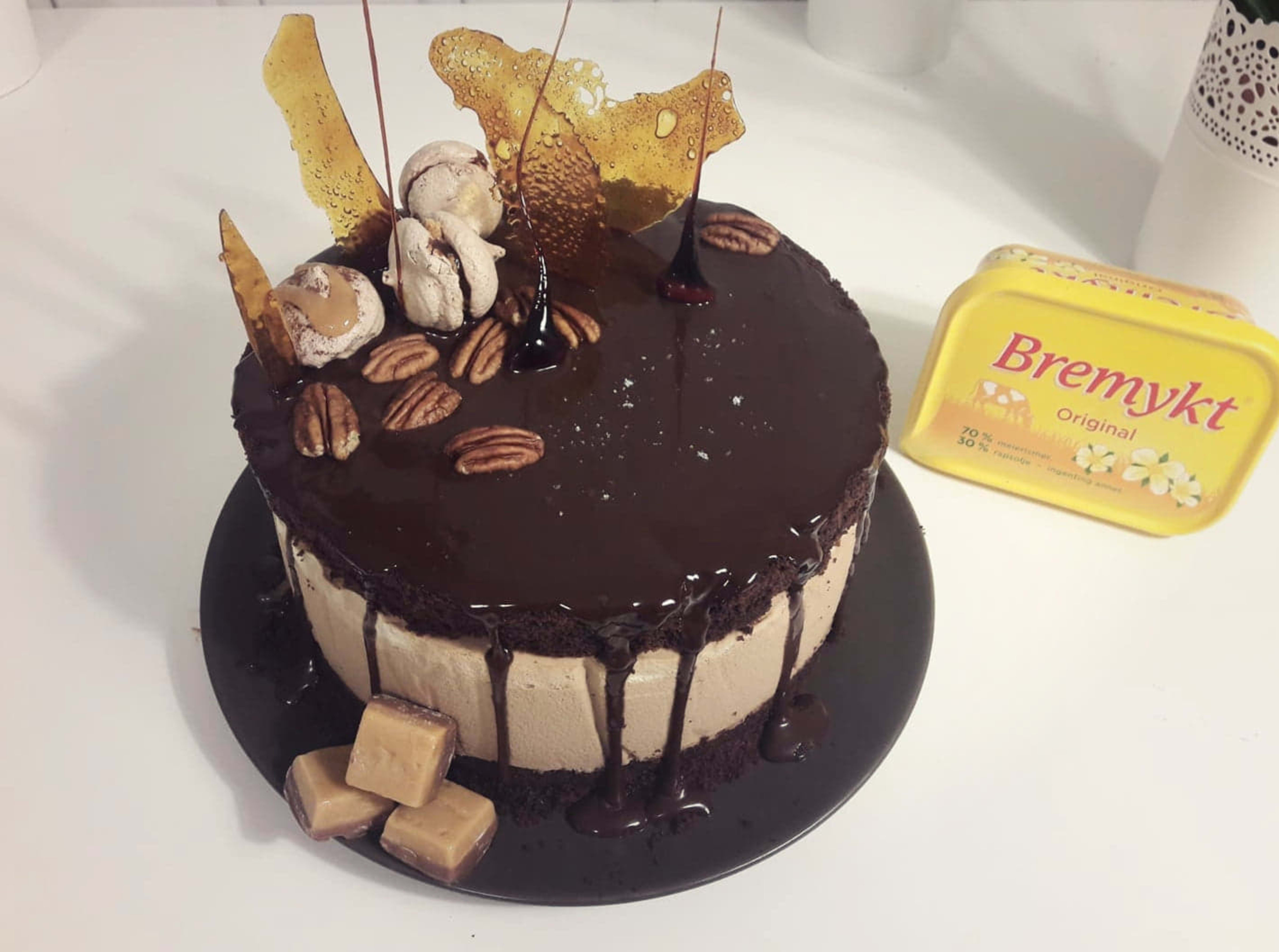 Tips! Det er best å dekorere kaken med ganache og karamell pynt dagen etter.