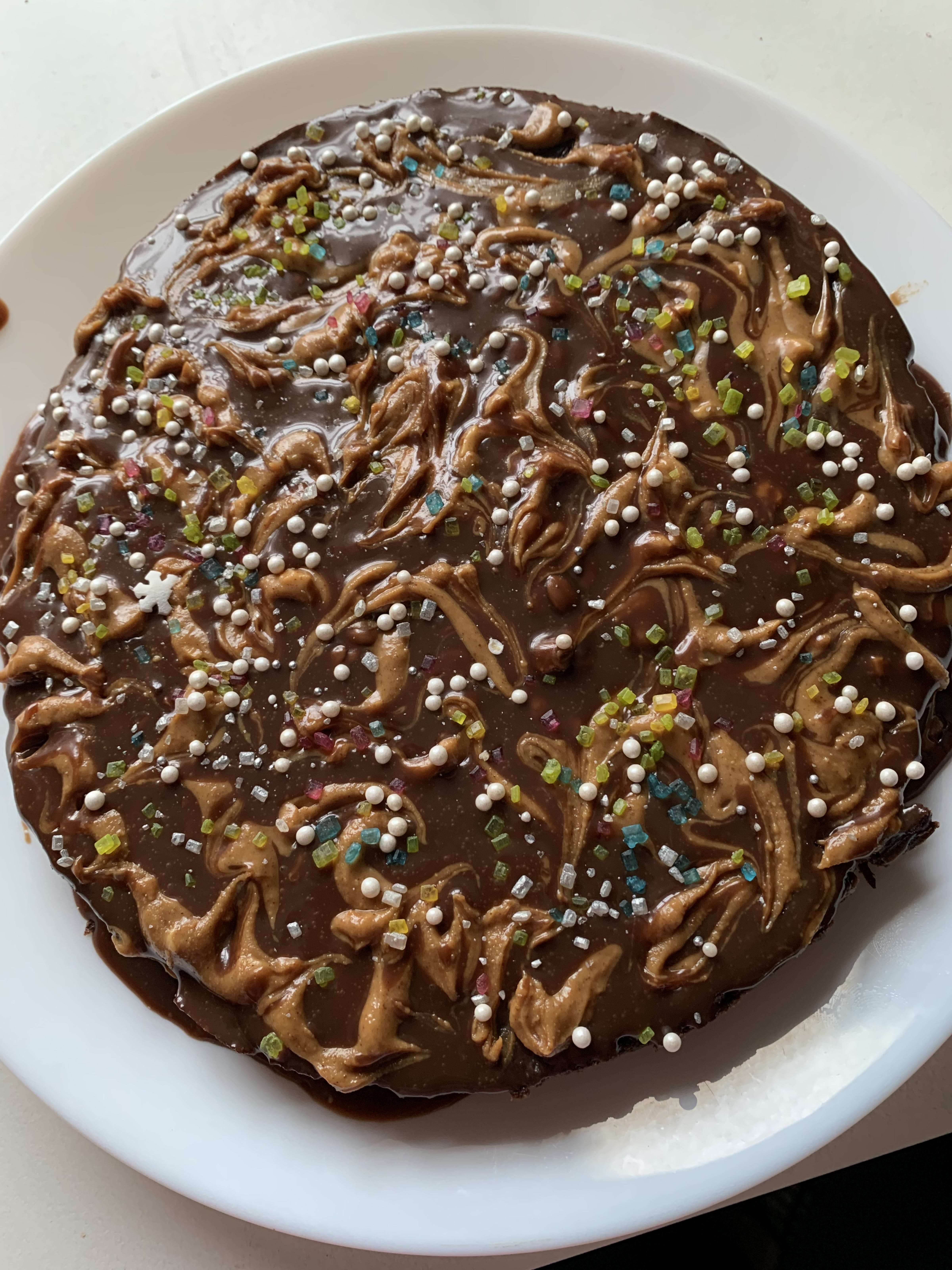 Smelt peanøttsmør og legg striper med bruk av gaffel på ganache. Bruk til å lage ønsket former på toppen av kake.