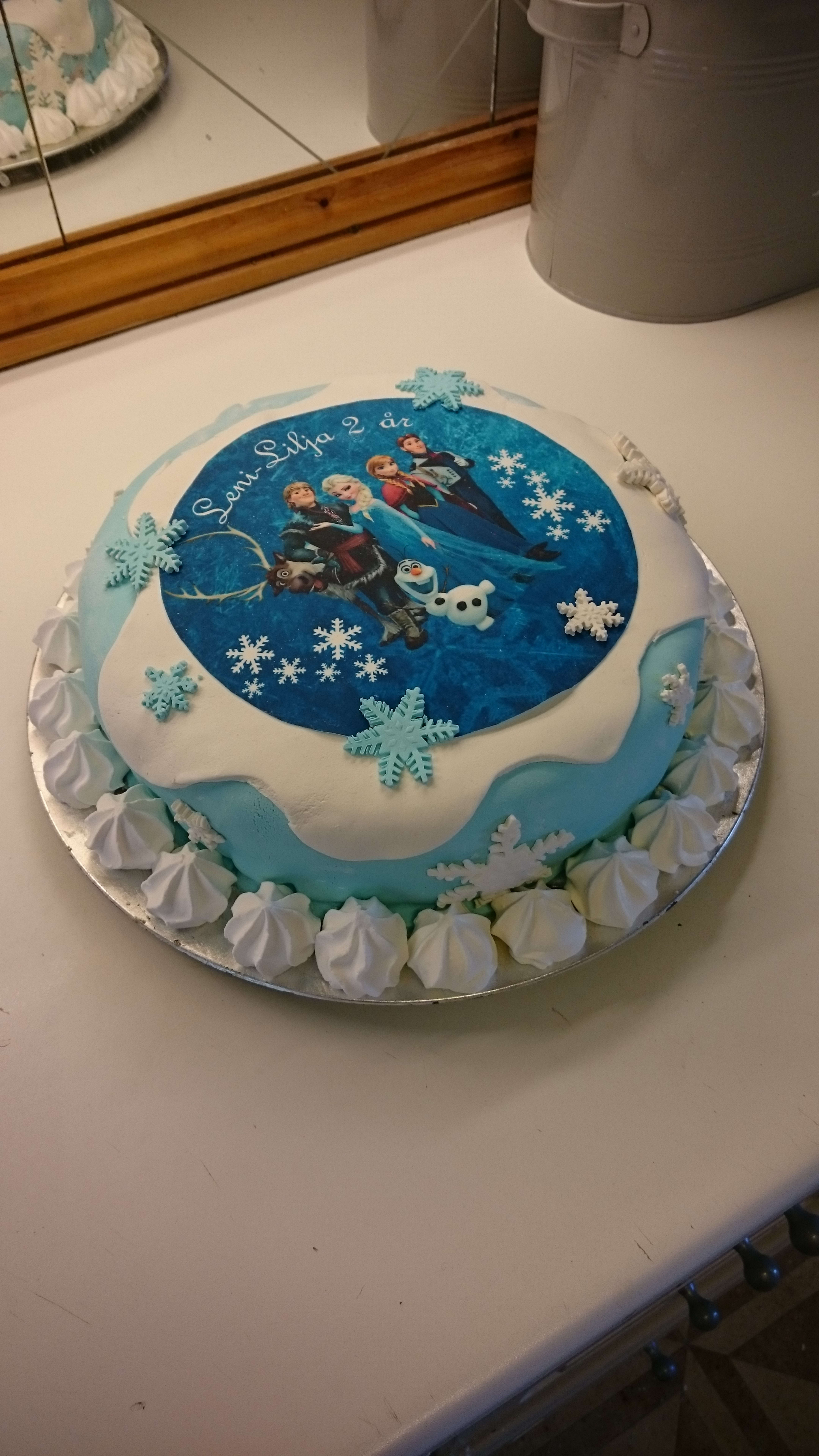 Jeg pyntet kaken med marsipan i Frost tema til datteren min, så derfor dekket jeg hele kaken med kremen også. Men man kan også dekke kaken med sjokolade glasur.