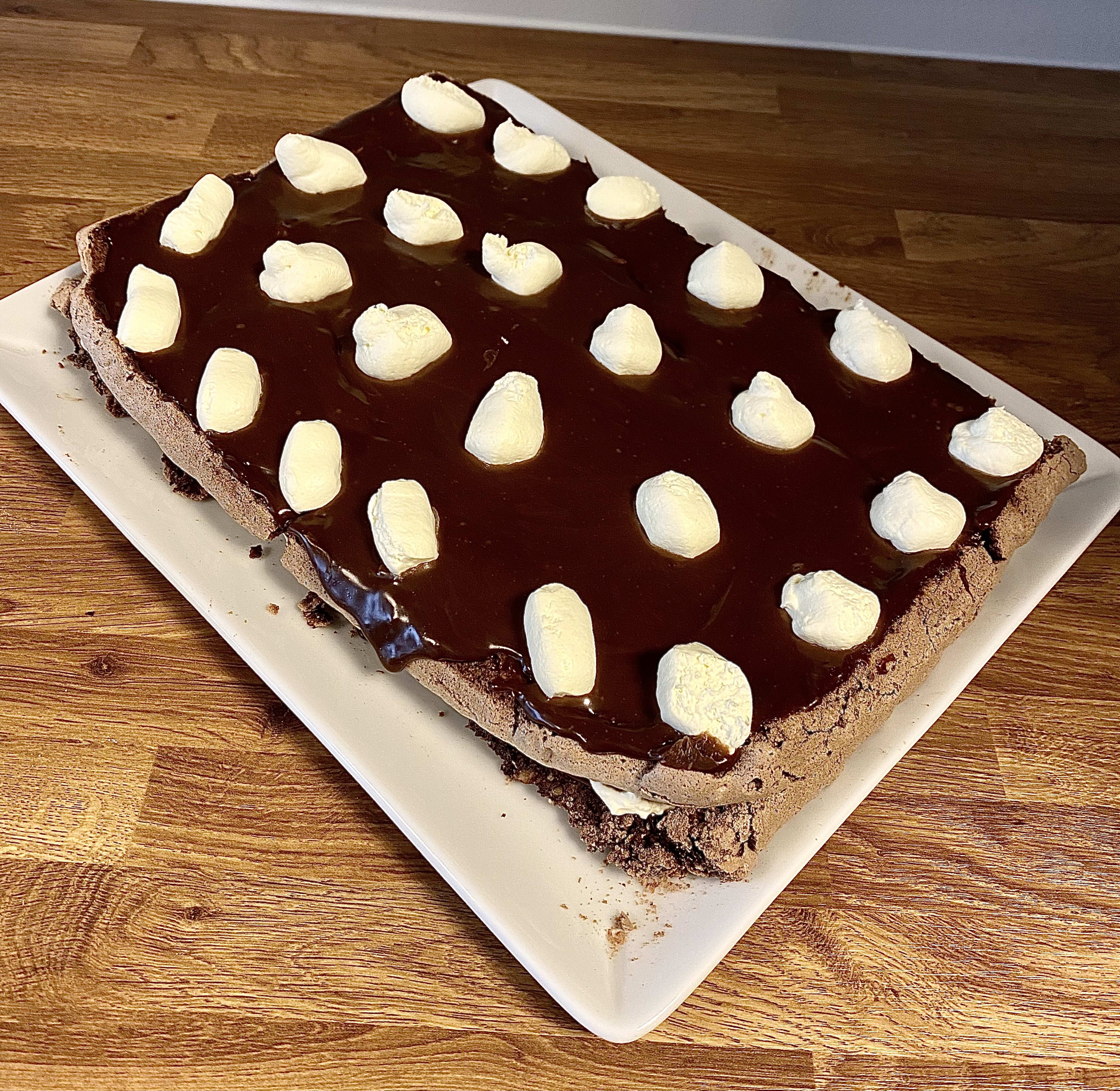 Eggehvitene piskes til hardt skum. Tilsett sukker litt etter litt, pisk til du får en glatt marengskrem. Mens marengsen piskes blander du nøttene, kakaoen og vaniljesukkeret. Når kremen er pisket glatt blander du forsiktig inn nøtteblandingen. Bre marengsen utover et stekebrett, stekes på 150 grader i 30-40 minutter.