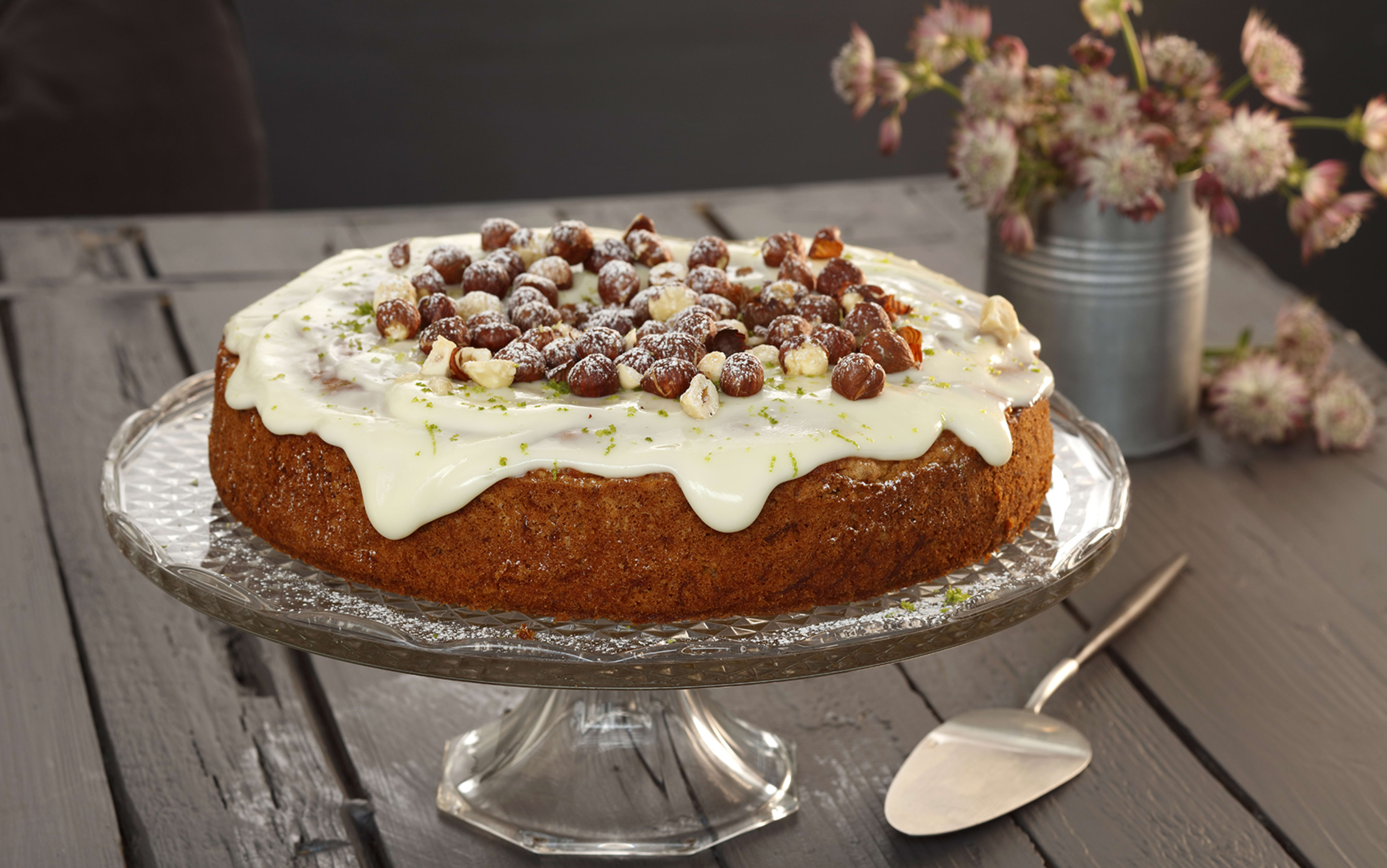 Fordel glasur over kaka, dryss over hasselnøtter og litt revet lime. Sikt gjerne over litt melis.
