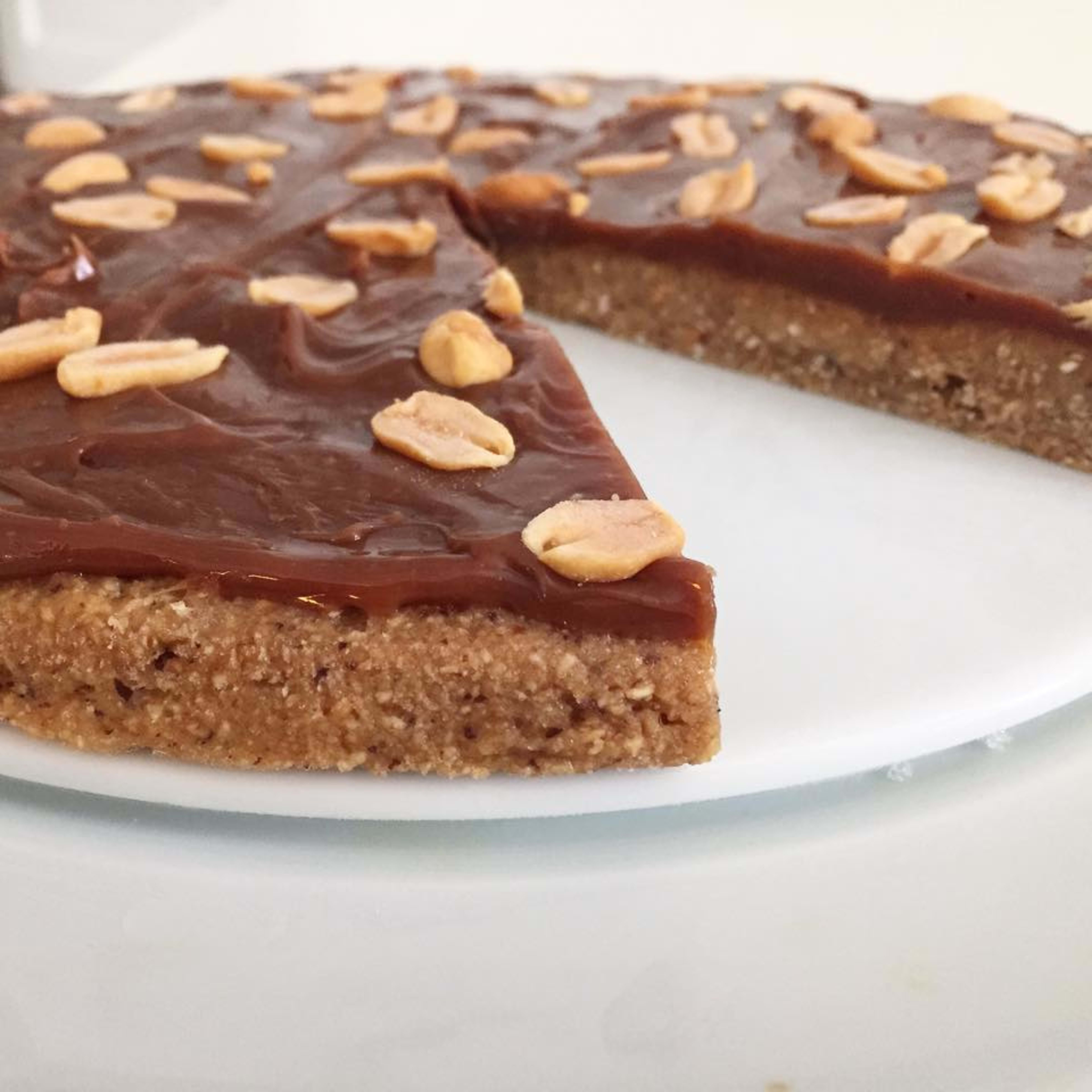Ta bunnen ut av frysen og smør toppingen utover snickersbunnen. Strø hakkede peanøtter på toppen og sett i frysen for avkjøling.