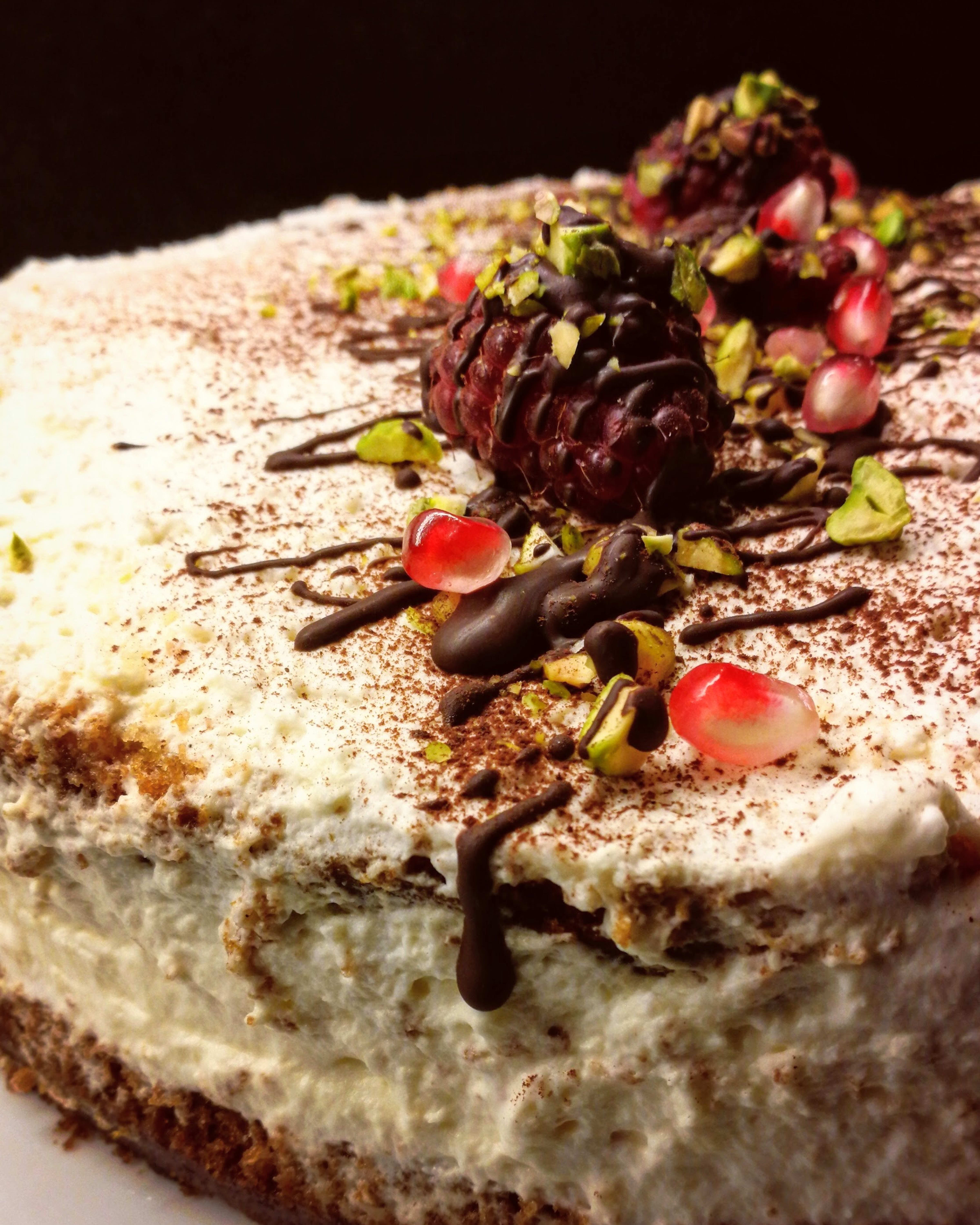 5. Grovhakk pistasjnøttene og strø dem over kremen. Hell sjokoladen over og legg den andre bunnen på toppen.