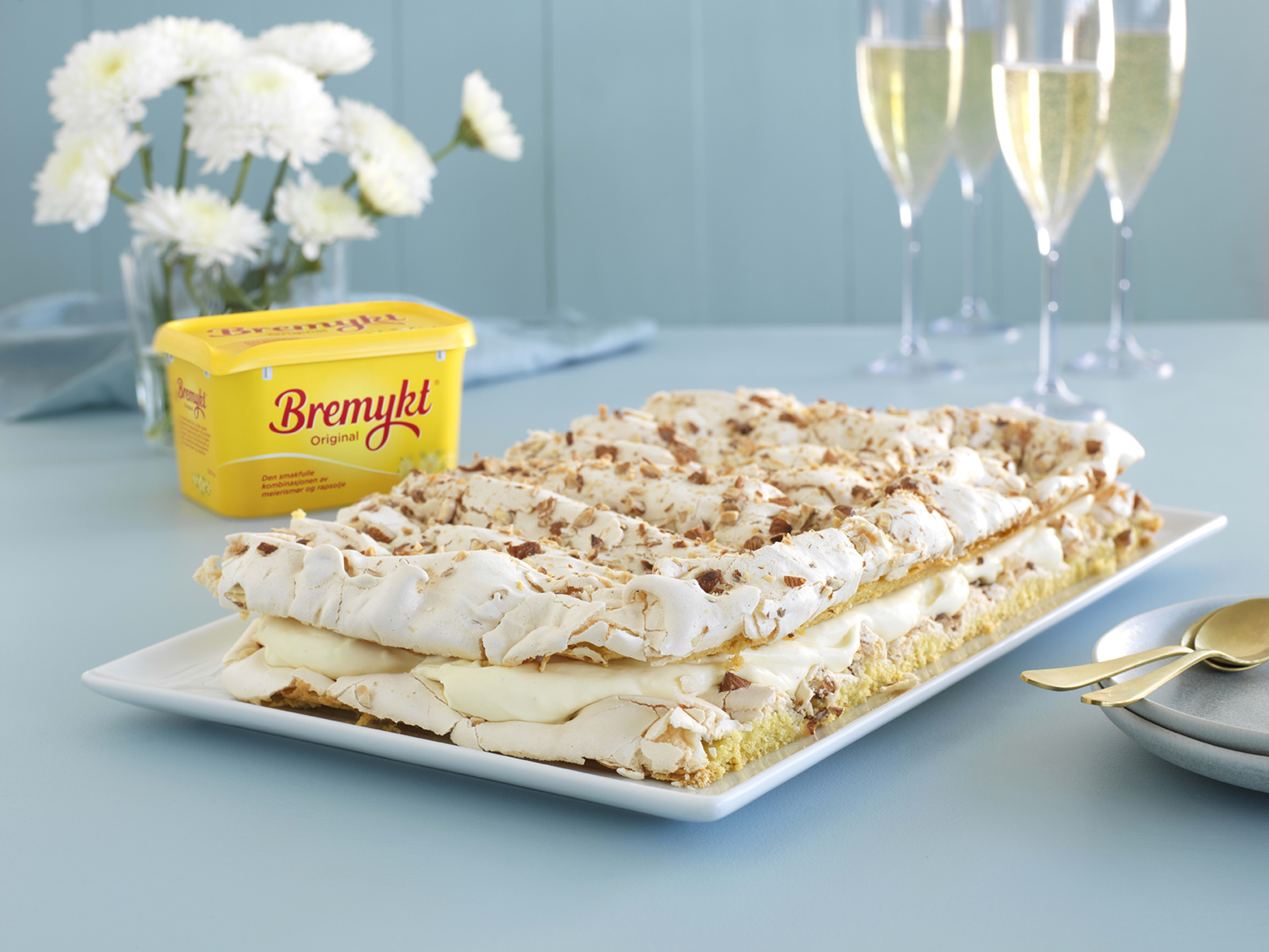 1. Bunn: Sett ovnen på 175°C. Bland sammen mel, bakepulver og melis. Smuldre i Bremykt. Tilsett eggeplommene og rømme og kna deigen raskt sammen. Pakk deigen godt i plast og legg den i kjøleskapet for å hvile en time. Del deigen i to deler og trykk hver ut i bunnen av en stor langpanne (ca 42 x 29 cm) med bakepapir. Stek midt i ovnen i 20 minutter. Avkjøl litt.