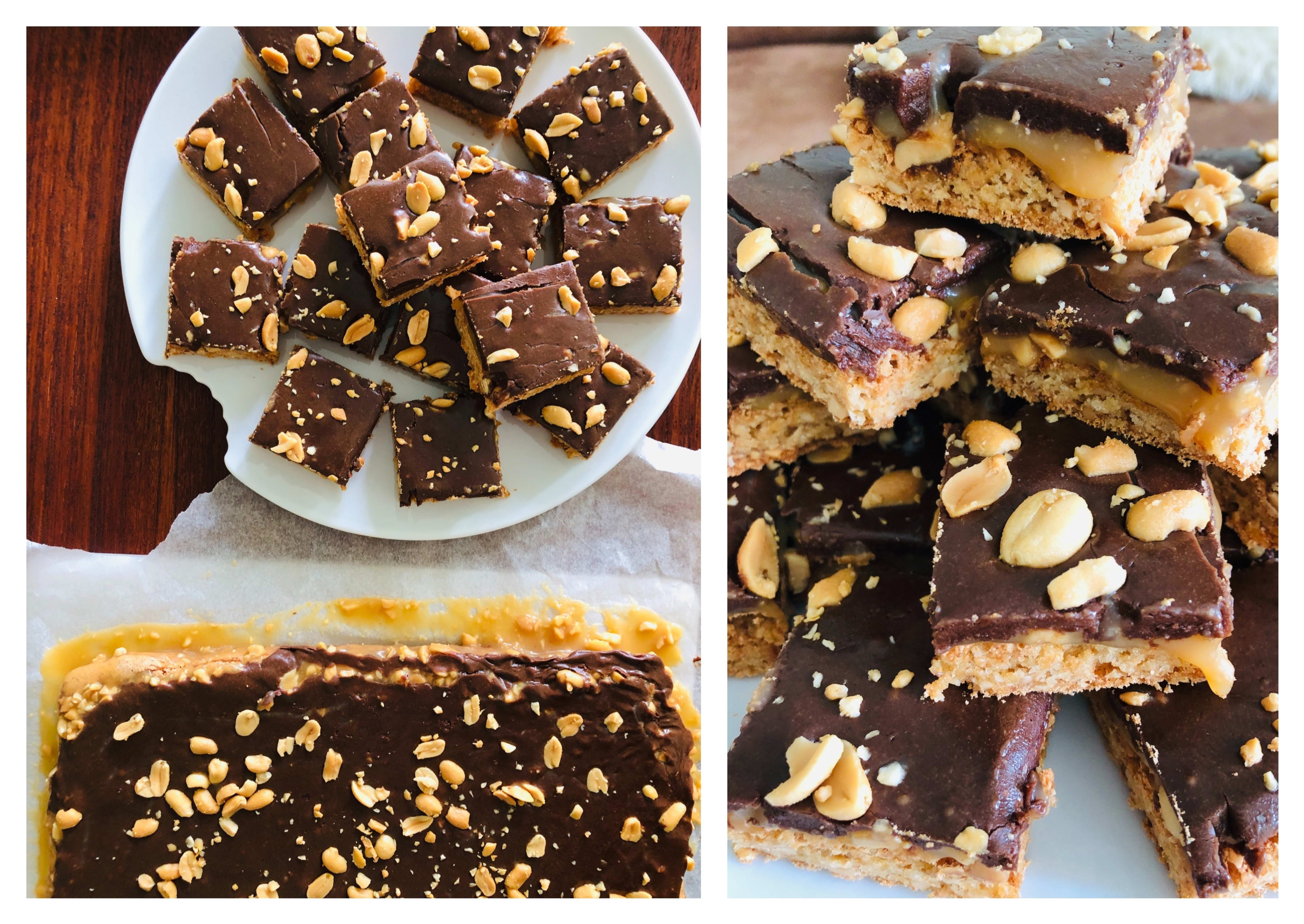 4. Blad grovhakkede peanøtter inn i karamellen og hell over den avkjølte kakebunnen. (Man kan gjerne sette kaken i kjøleskapet til karamellen stivner)