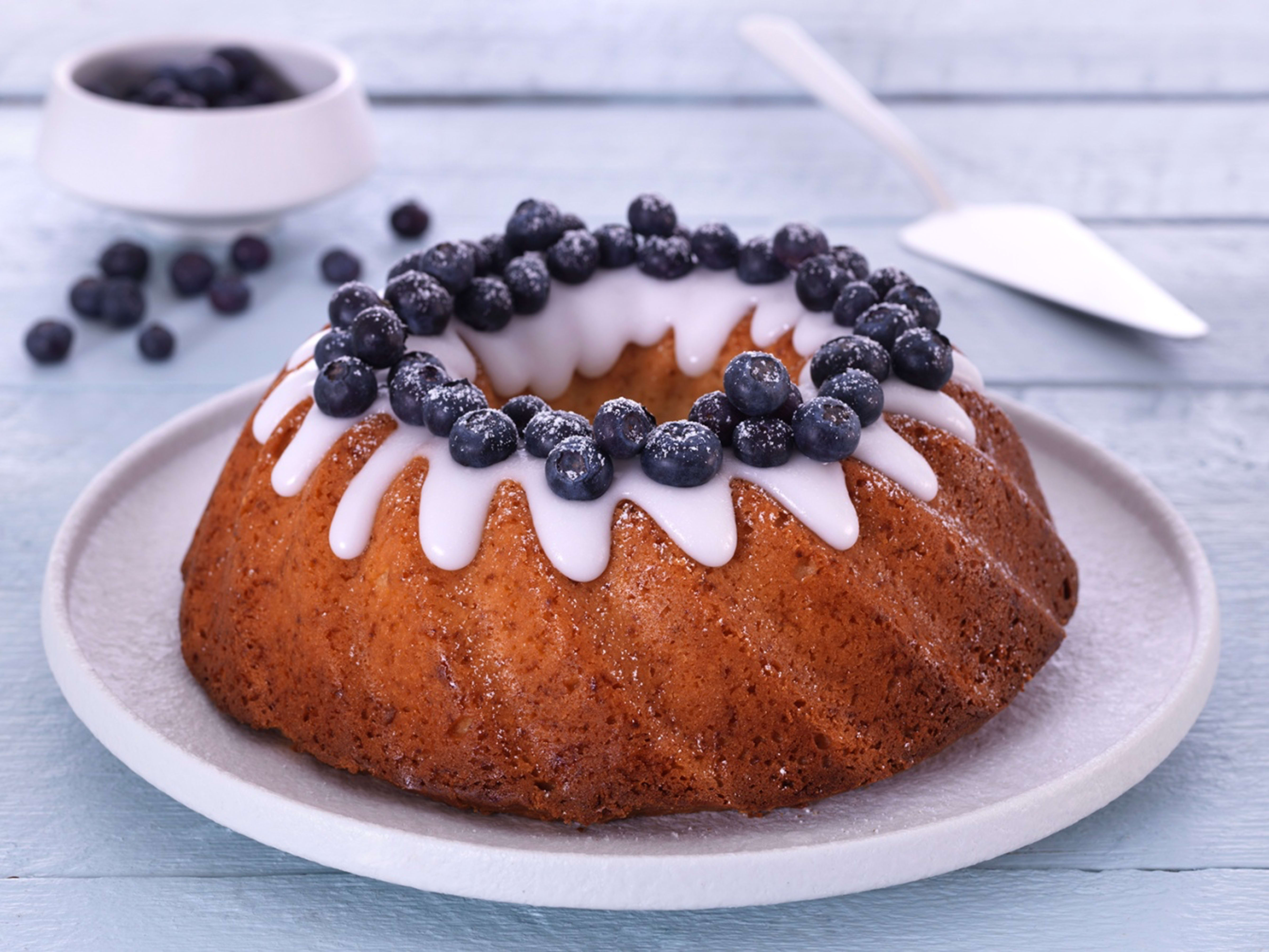 Bland sammen melis, sitron og vann til en litt tykk glasur, ha den over den avkjølte kaka og pynt med friske blåbær. Dryss til slutt over litt melis.
