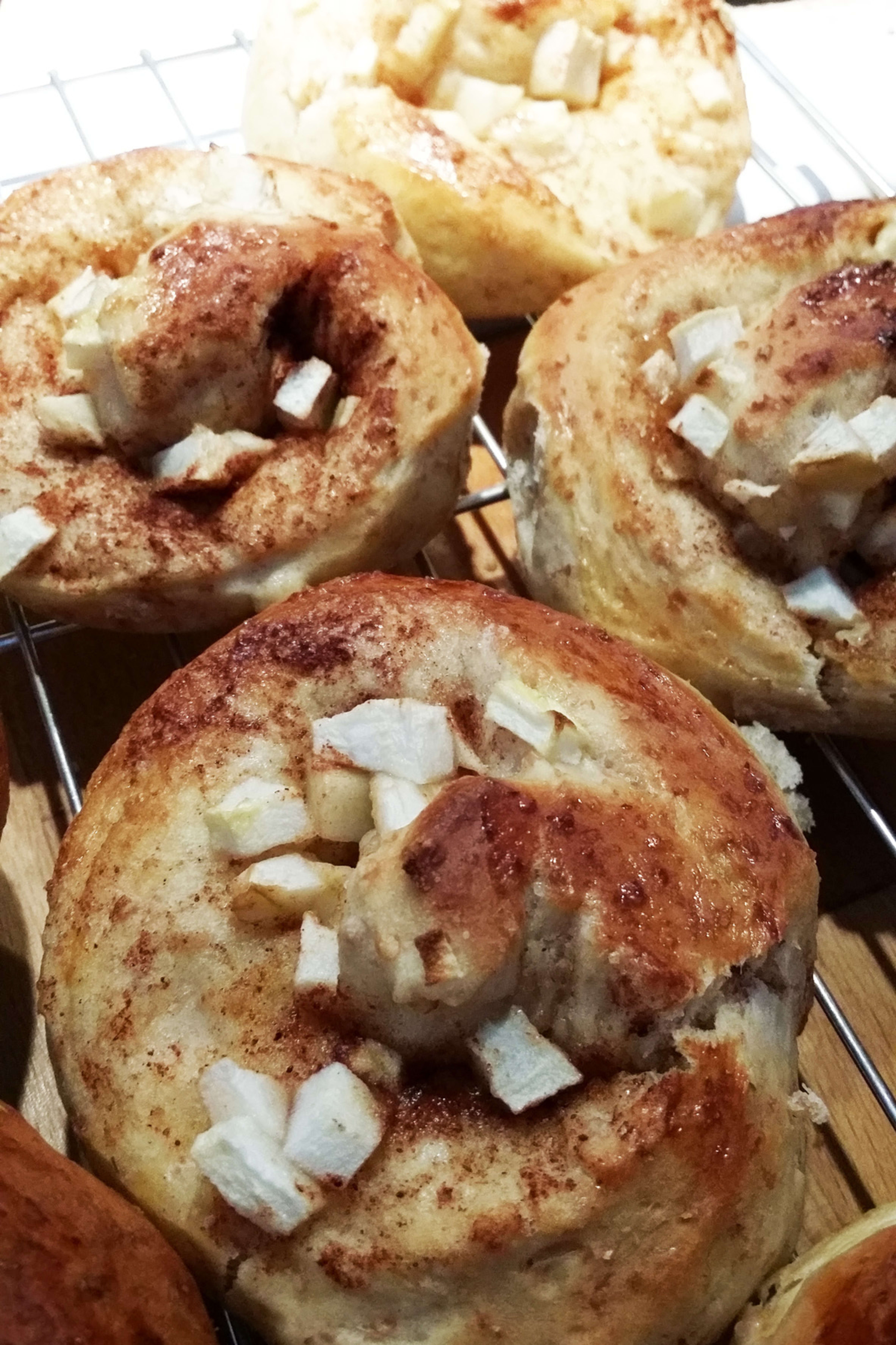 6. Skrell eplet, fjern kjernene og del det i små terninger, ca 0,5x0,5 cm. Strø disse over leiva, og rull sammen.