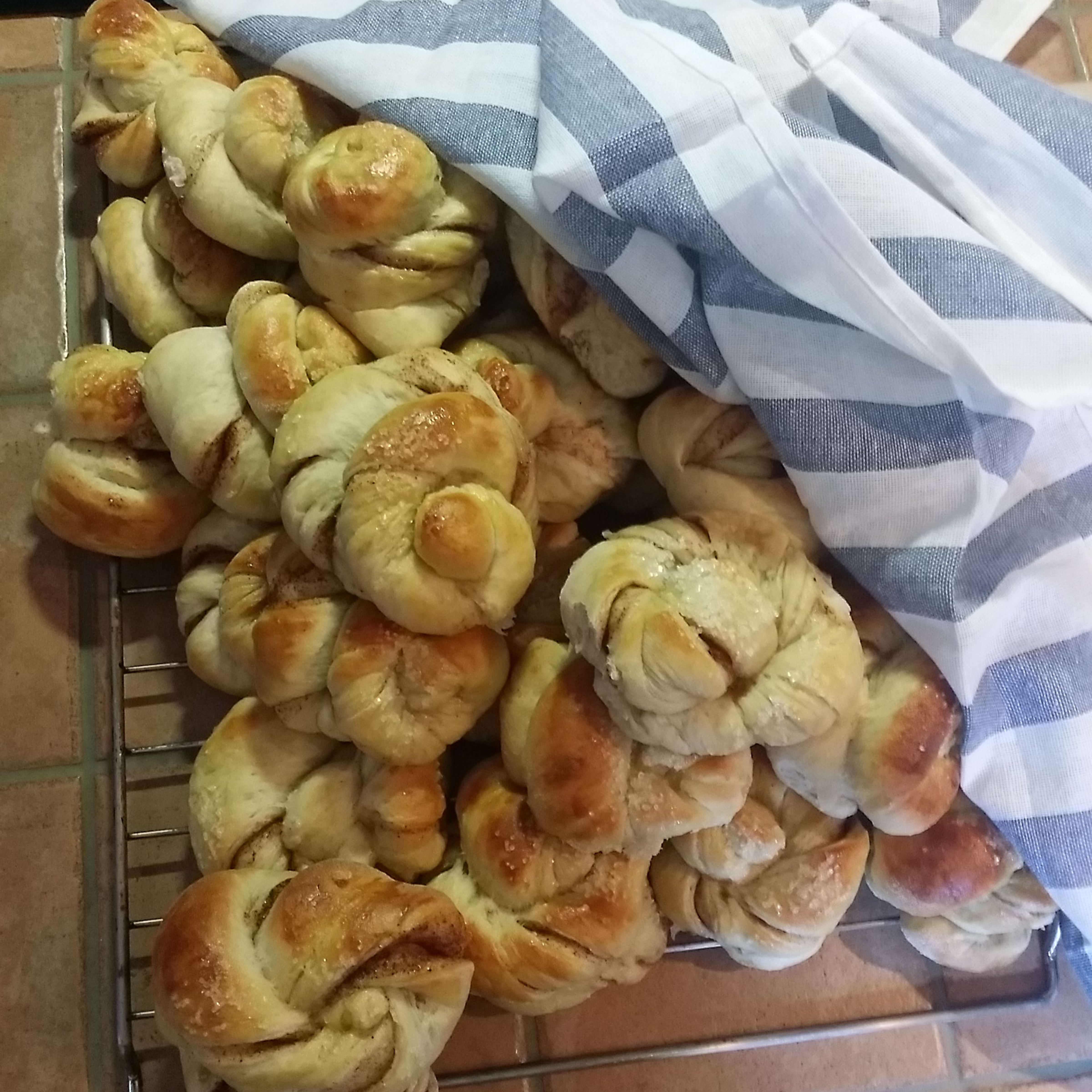 Kjevle ut og smør på smør og dryss sukker og kanel over. Brett sammen og skjær remser som snurres sammen til en knute.