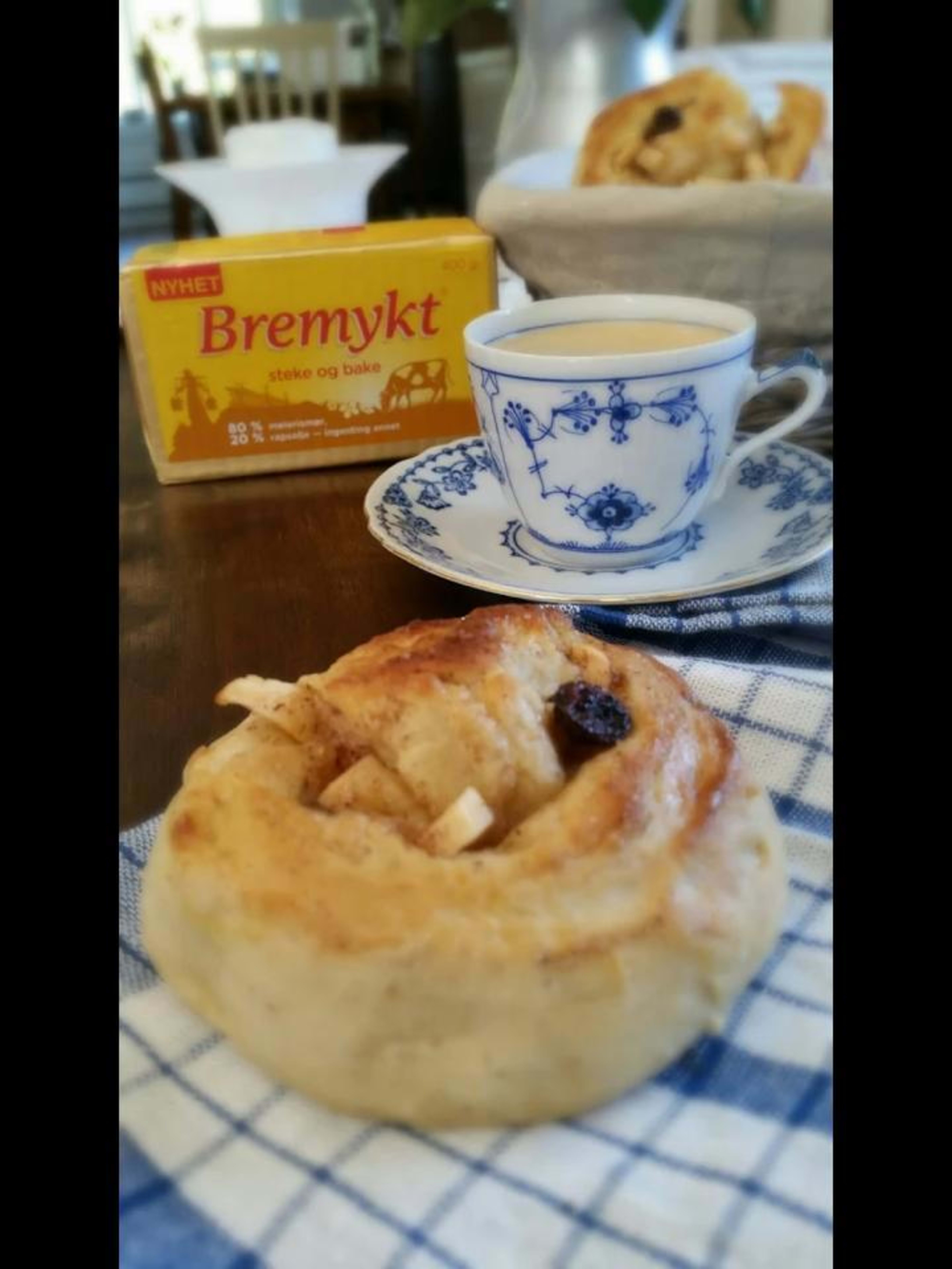 - kjevle ut deigen og smør på smørblandingen, strø over eplebiter og rosiner.