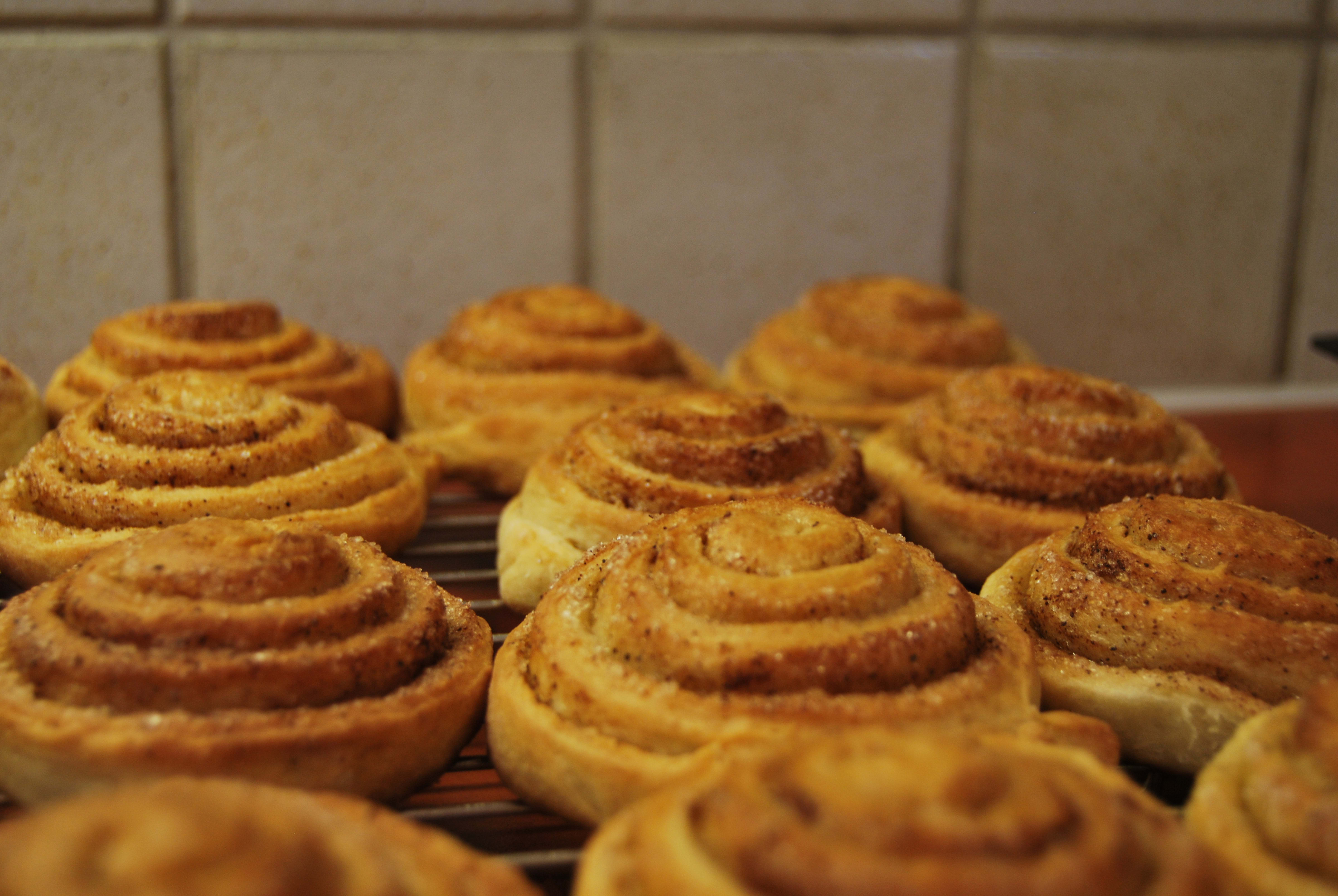 Del deigen i 4 deler, kjevle en og en del, smør fyllet på hele deigleiven, rull sammen, skjær skiver og legg på en smurt plate. Klem hver skillingsbolle litt ned, smør med sammenpisket egg og strø på perlesukker.