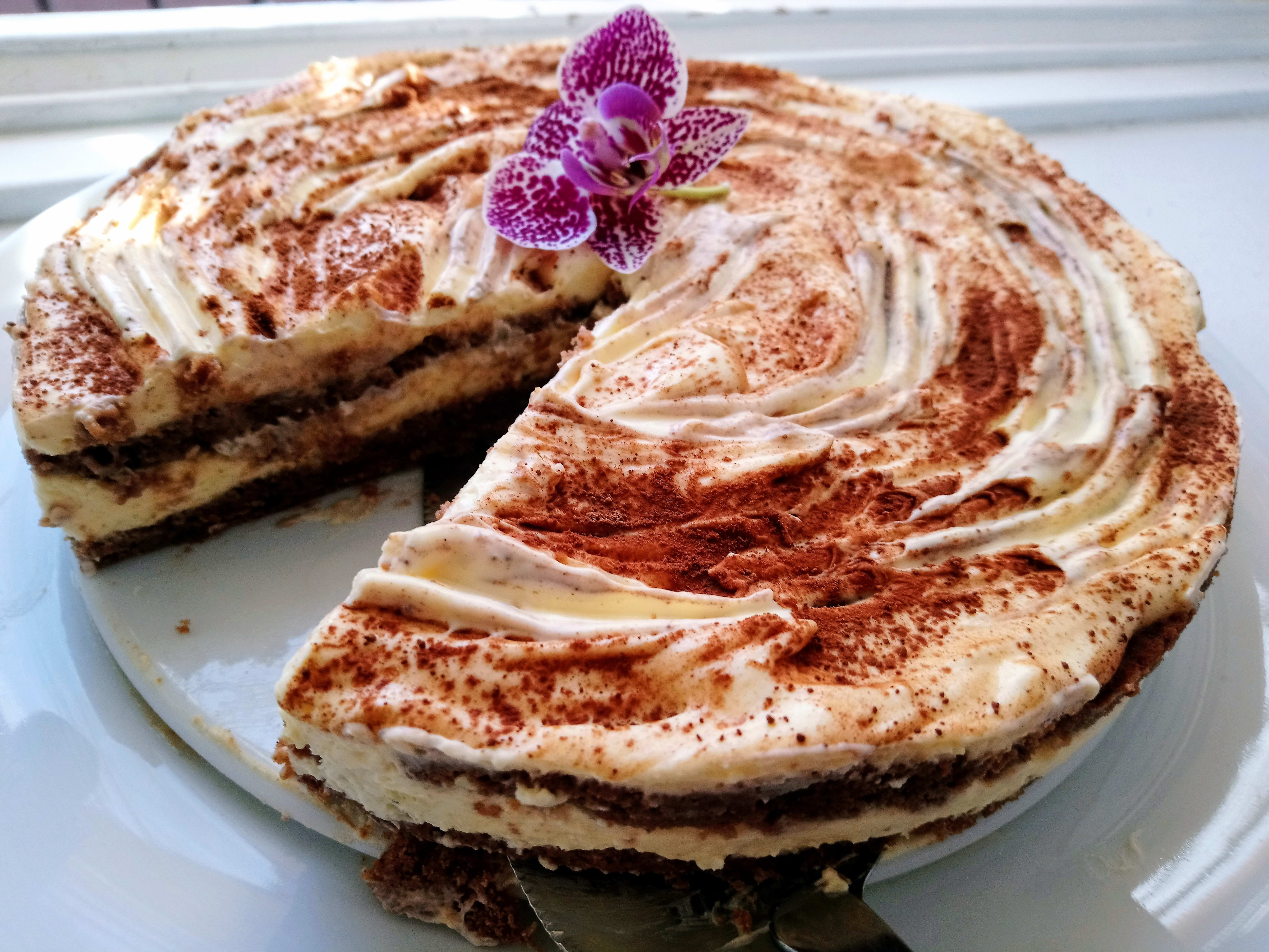 Pisk inn ost og tilsett gelatinen i en tynn stråle rør godt. Vend til slutt inn vispet krem. Hell halvparten av kremen på toppen av kakebunnen. Legg på en ny bunn, dynk med kaffe og topp med resten av kremen.