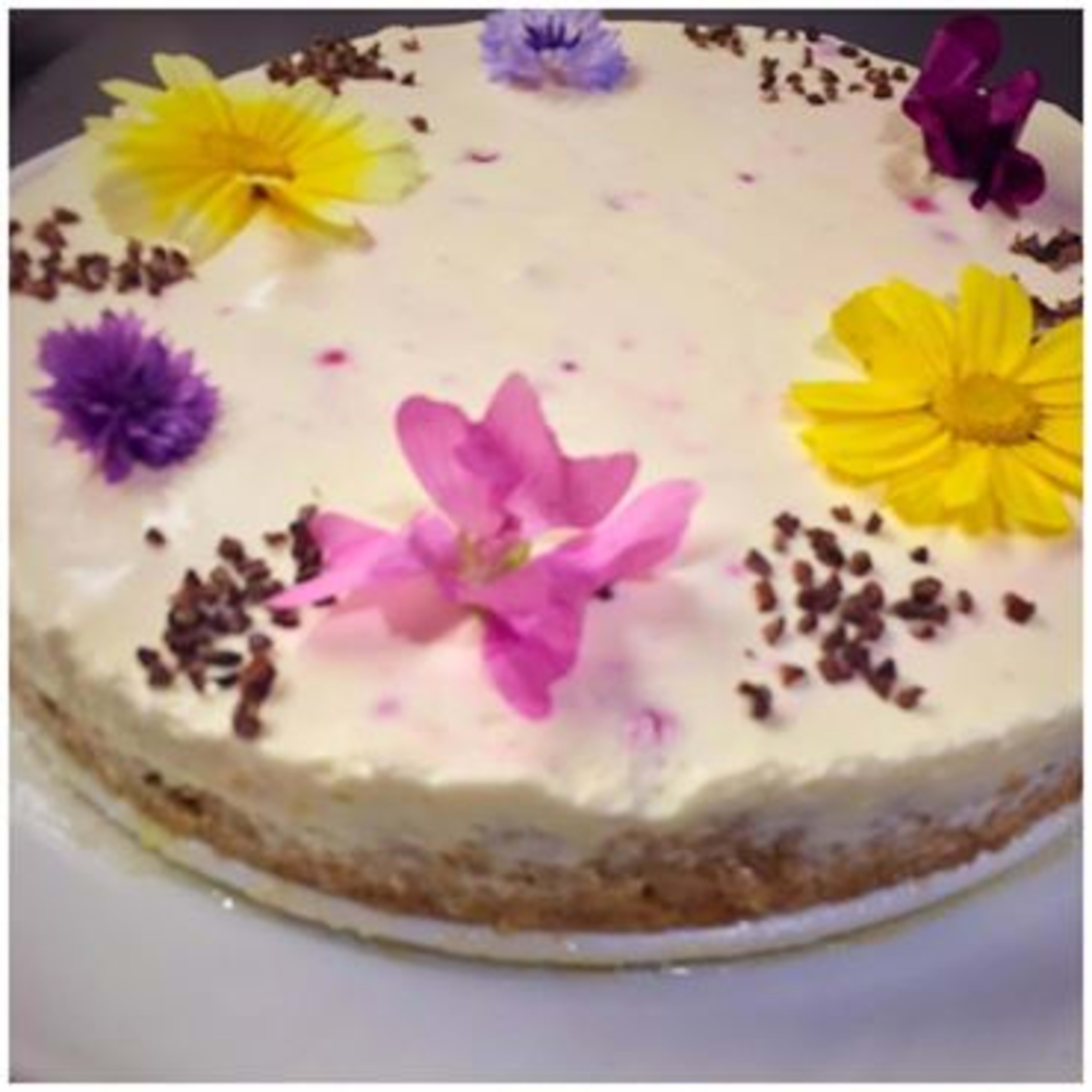 Jeg pyntet med spiselige blomster og litt rawkakao nis, men du kan også bruke friske blåbær.
