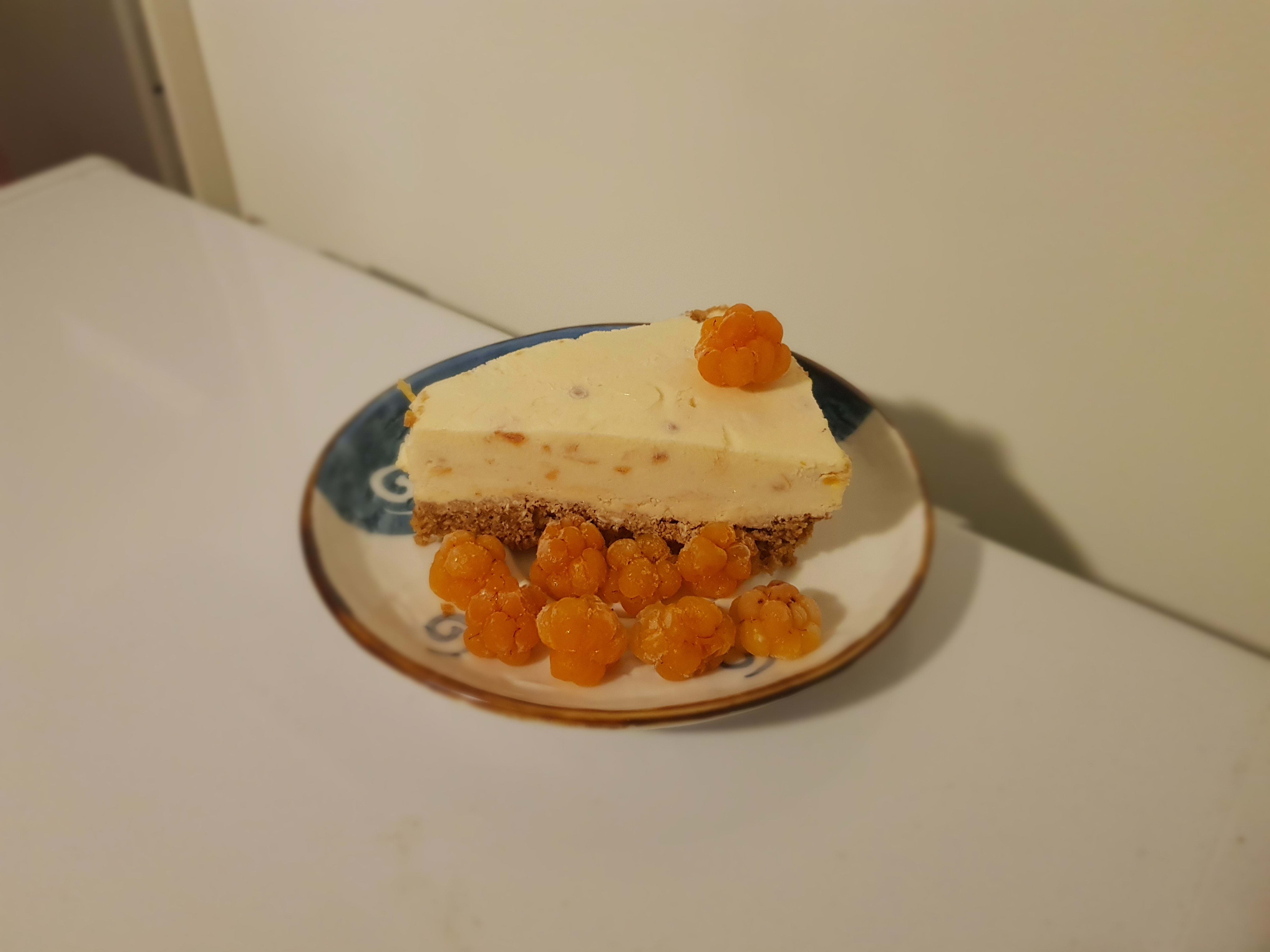 7. Bland multeblandingen sammen med bollen med kremostblandingen. Visp godt i noen sekunder, så blandingene jevnes. Fordel blandingen over kjeksen i kakeformen.