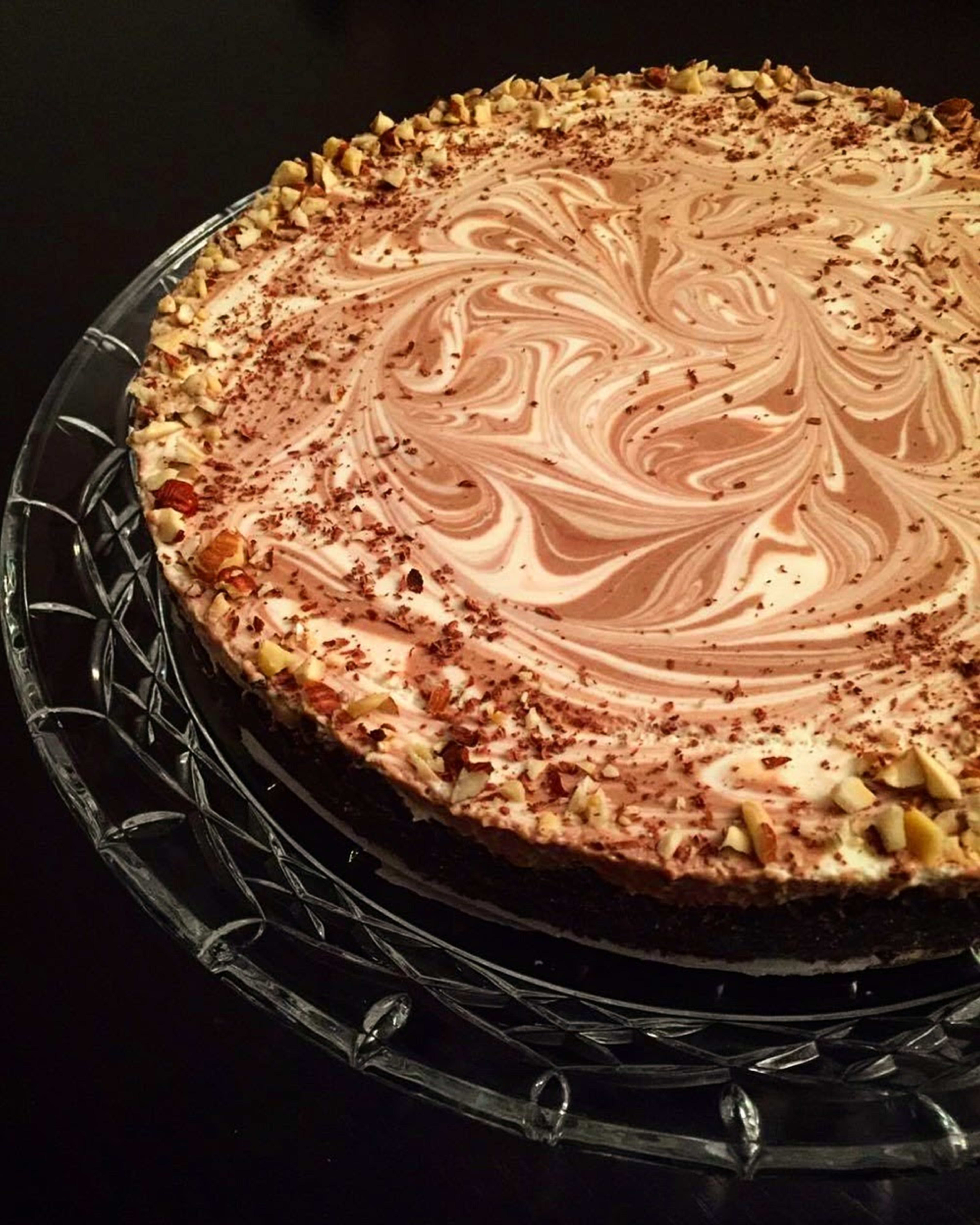 5. Varm opp Nutella i mikrobølgeovn til den har en rennende konsistens. Pass på at den ikke er for varm, bland dette sammen med ostefyllet du satte til side. Du kan nå helle dette rett over ostefyllet i formen, eller legge små skjeer av Nutella-blandingen på toppen og bruke en kniv eller grillpinne for å gi kaken et marmorert preg, slik du ser på bildet.