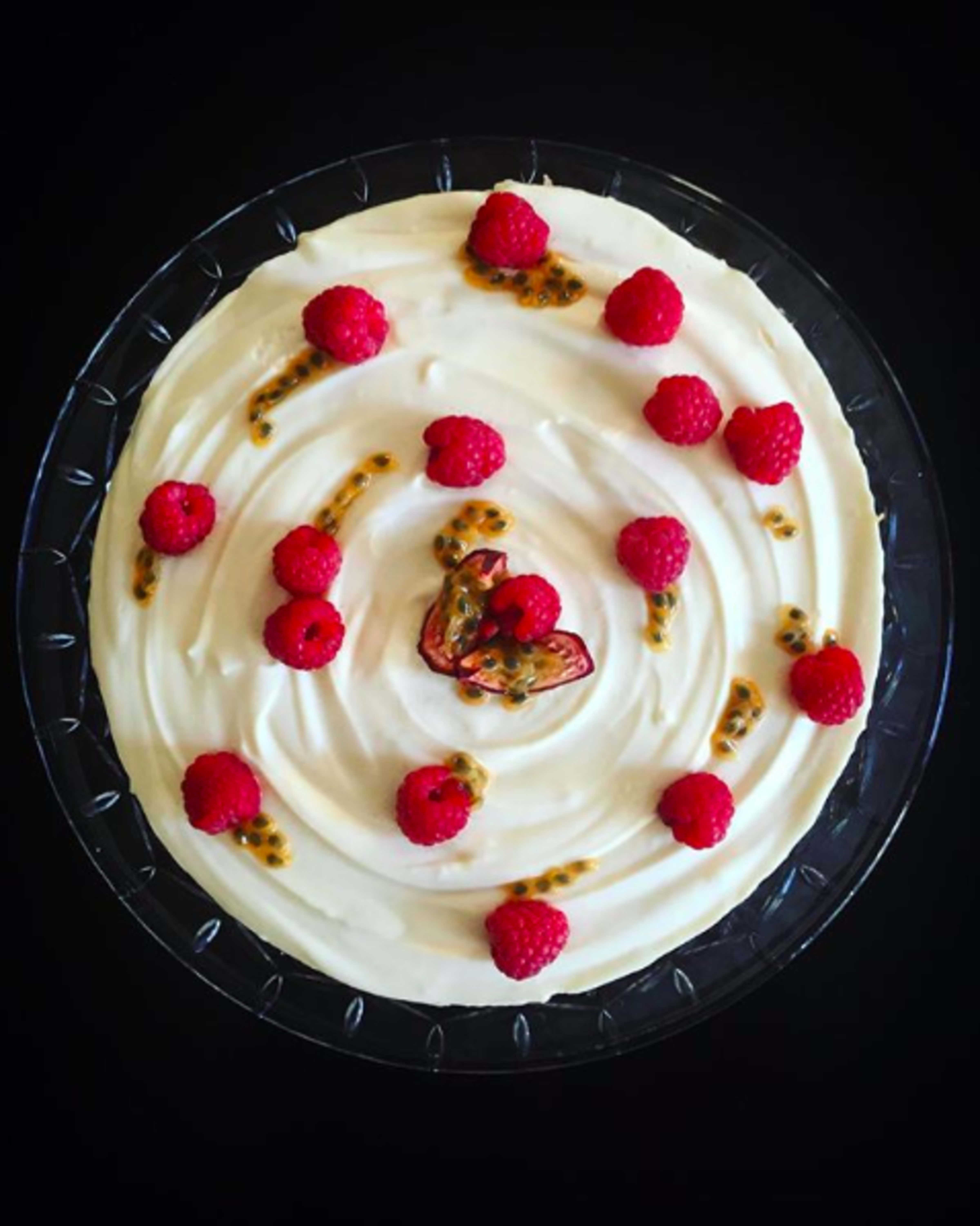 7. Pynt kaken med bringebær og pasjonsfrukt og eventuelt revet sjokolade før servering.