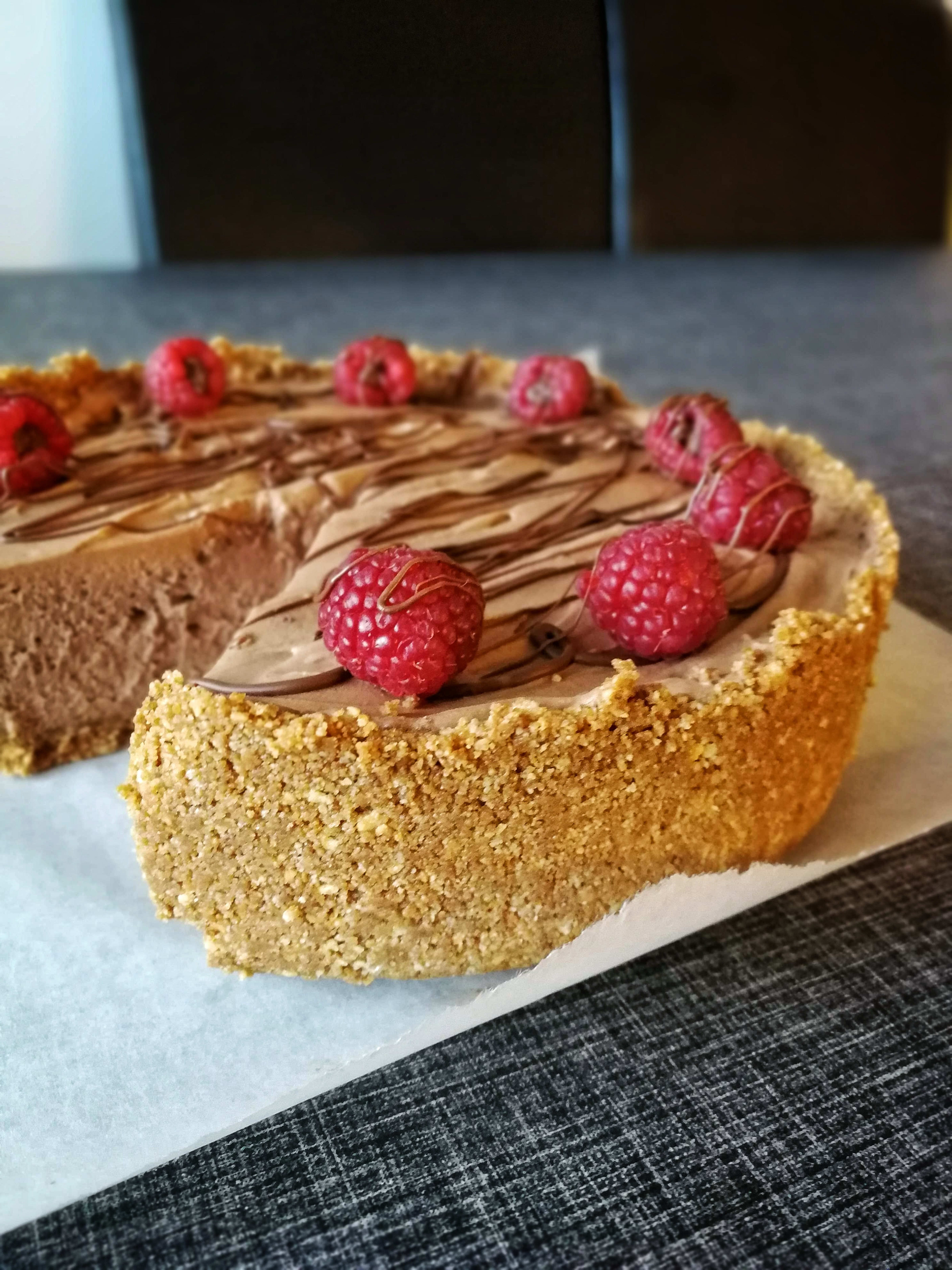 8. Pynt kaken med noen ekstra bringebær og litt smeltet sjokolade. Nyt!