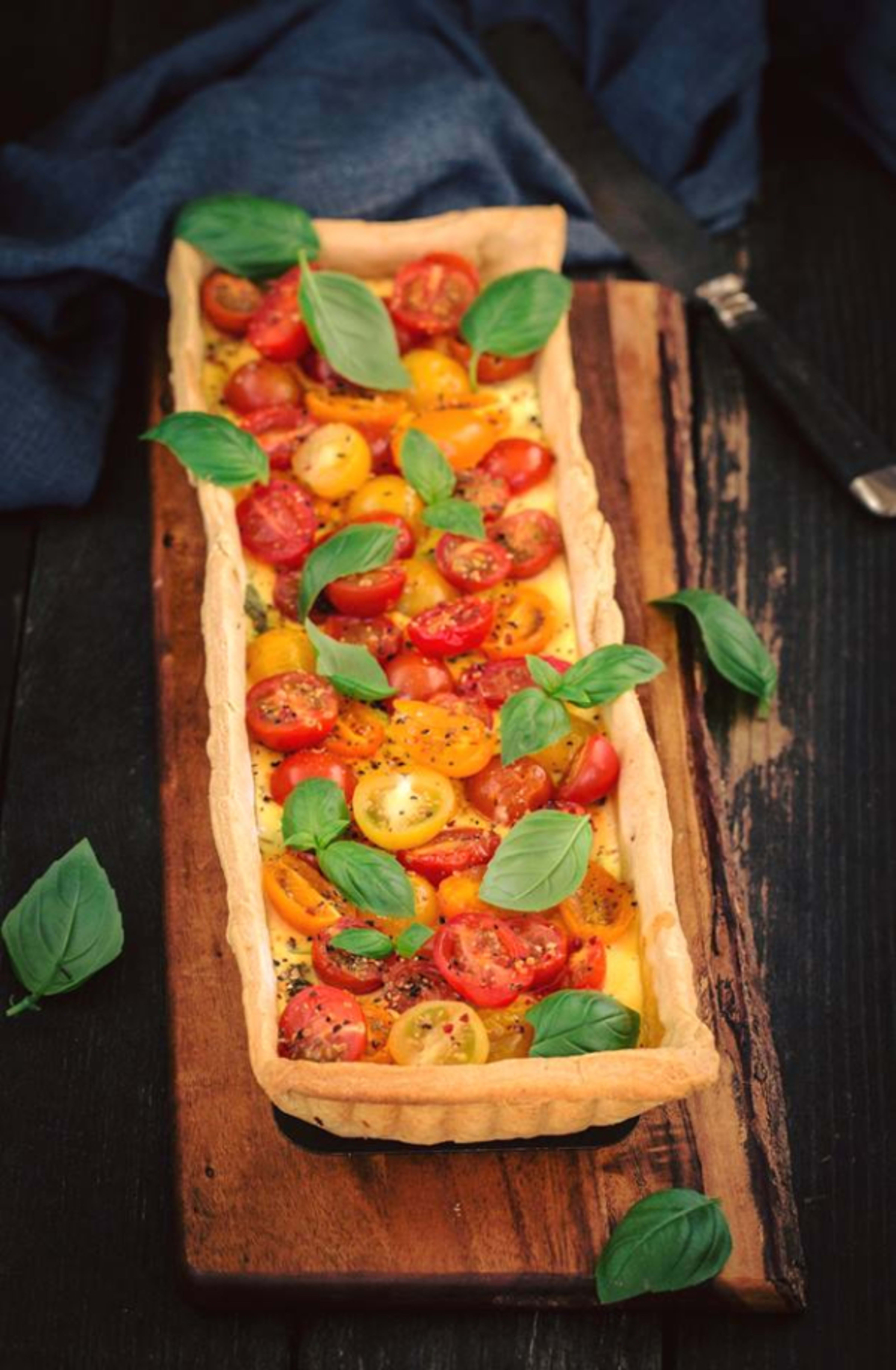 Pisk sammen egg , geitost og rømme i en bolle og ha i litt salt , pepper og hakket basilikum og pisk godt. Ha fyllet i tertebunnen. Ha i cherrytomater, delt i to, dryss over 1 ss olivenolje og pepper .