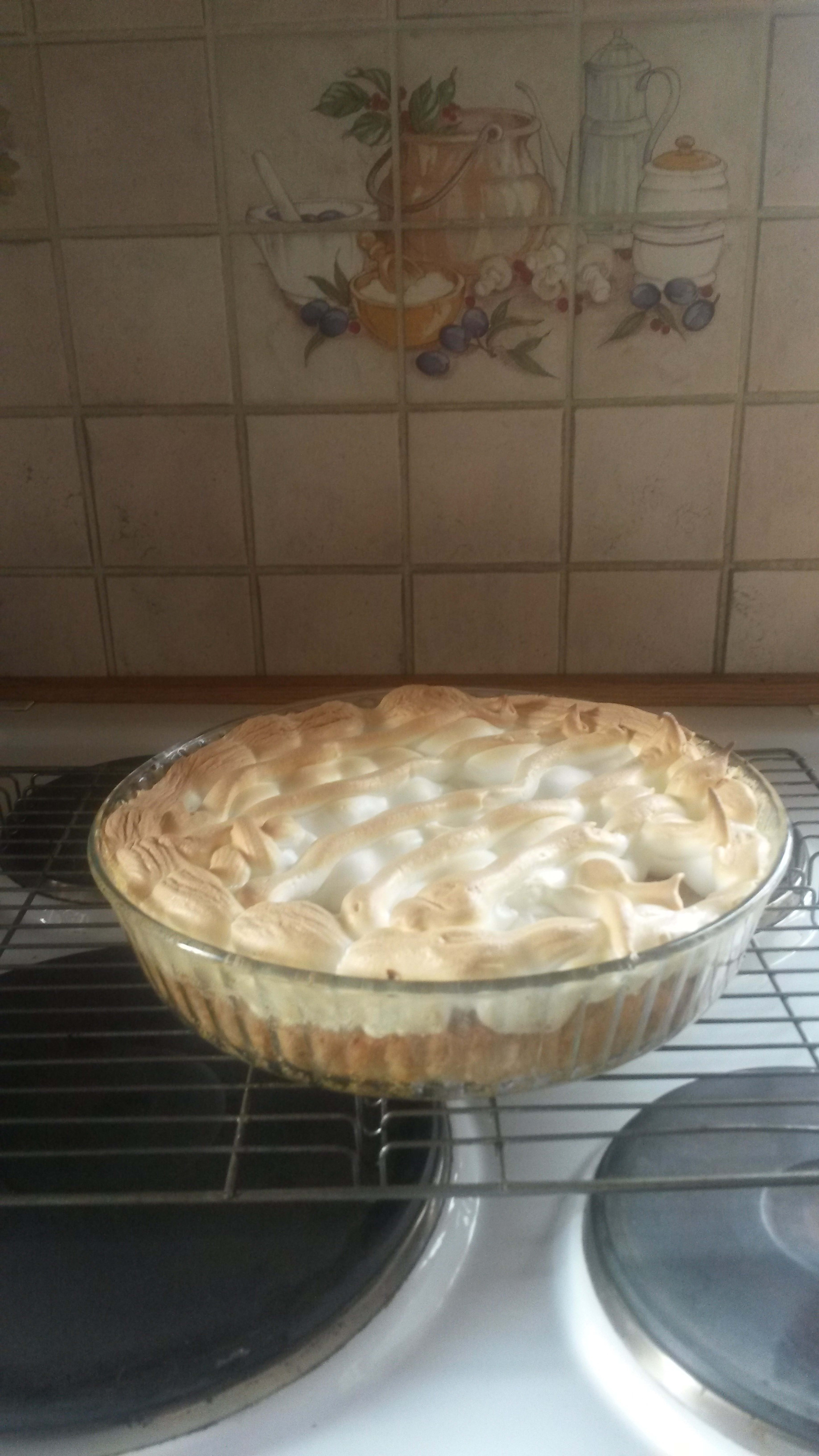 - Ta paien ut av ovnen og sprøyt et gitter av marengs over toppen. Skru ned temperaturen litt på ovnen, og sett så paien inn igjen. Stek paien til marengsen har fått noe farge.