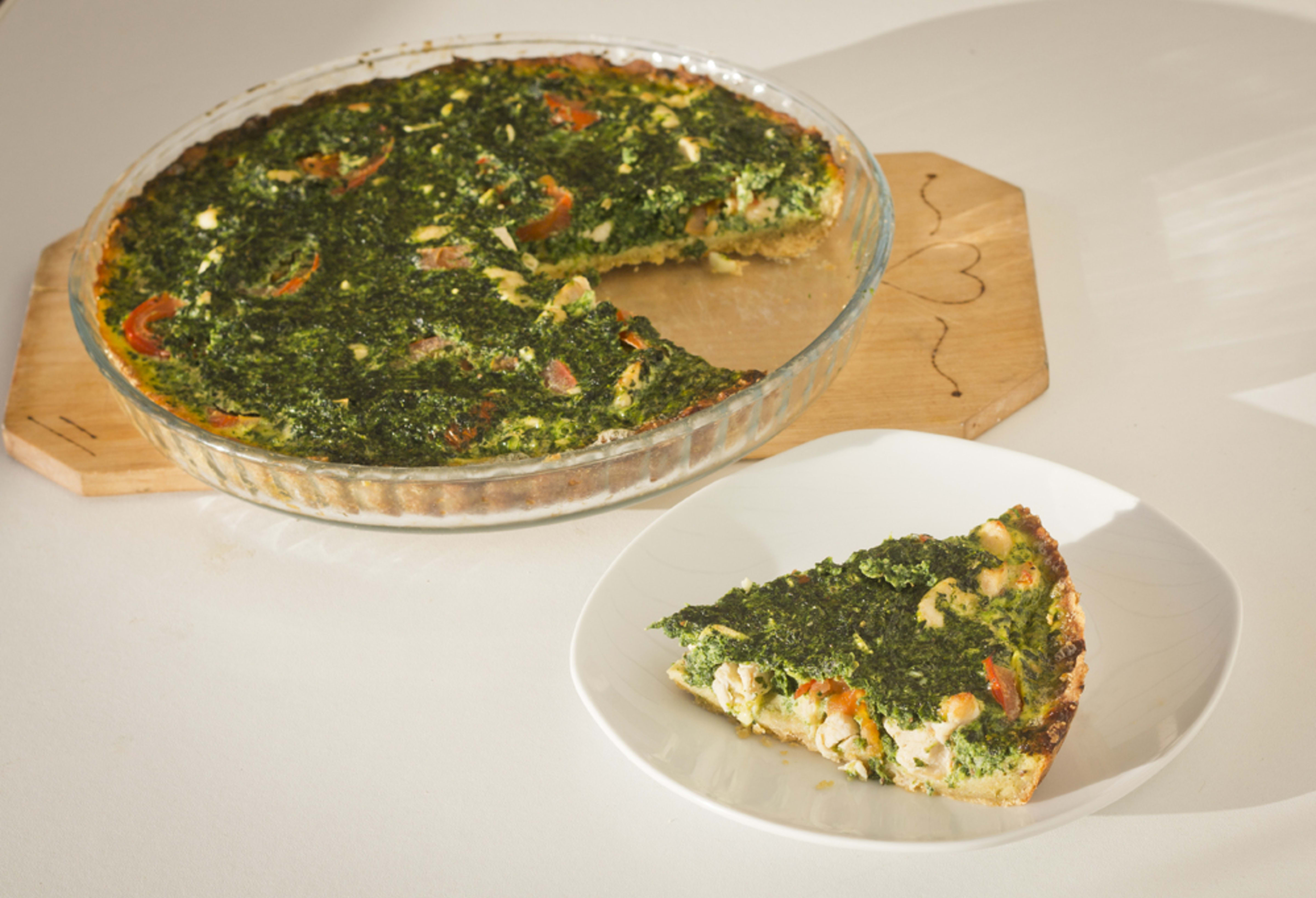 9. Når bunnen er ferdig stekt tar du den ut av ovnen og fyller den med stekte kyllingbiter og oppkuttet tomat. Hell deretter spinat-blandingen over.