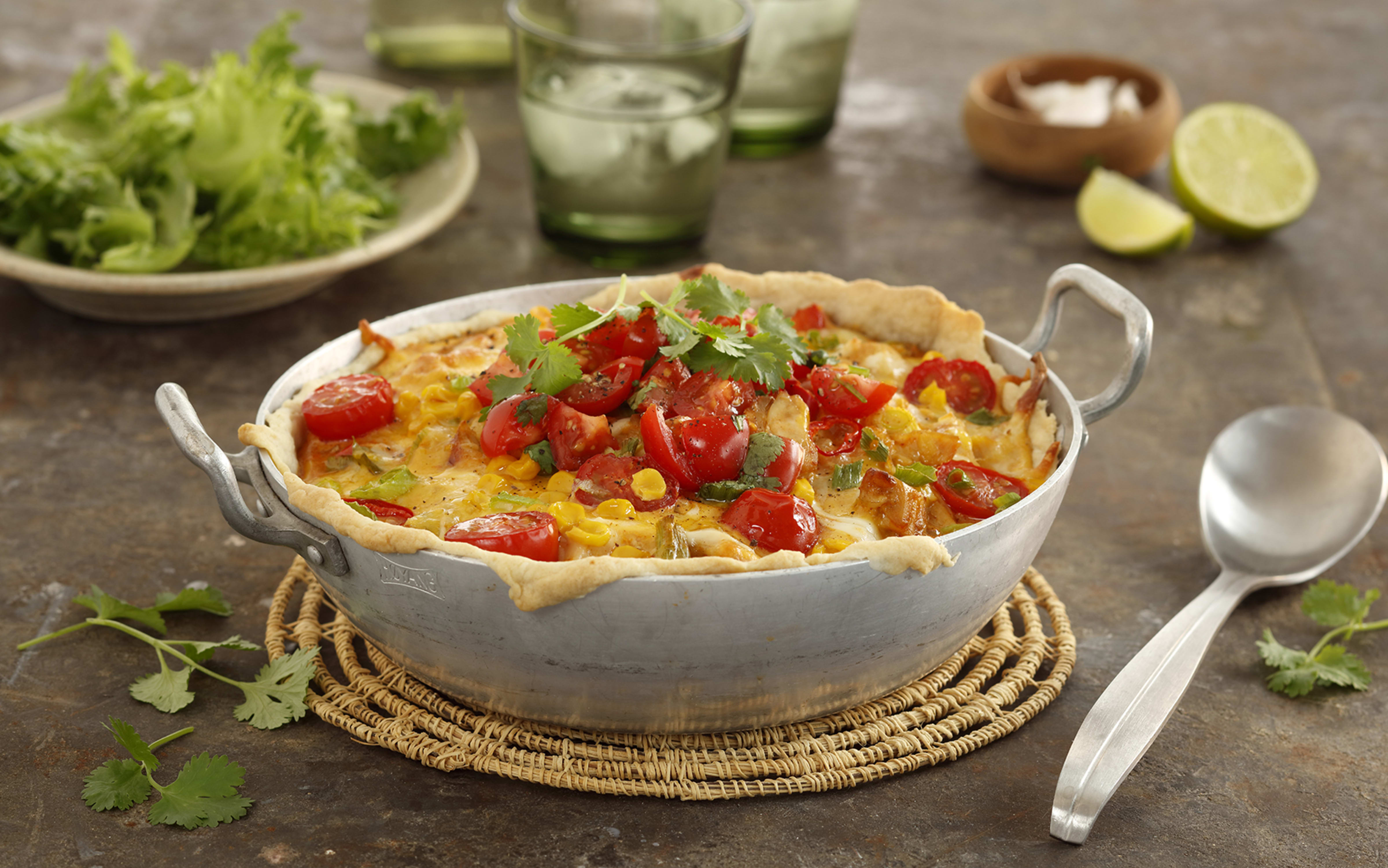 Stek paien på midterste rille ca. 20 minutter til osten er gyllen og paien er gjennomvarm. Dryss over frisk koriander og server.