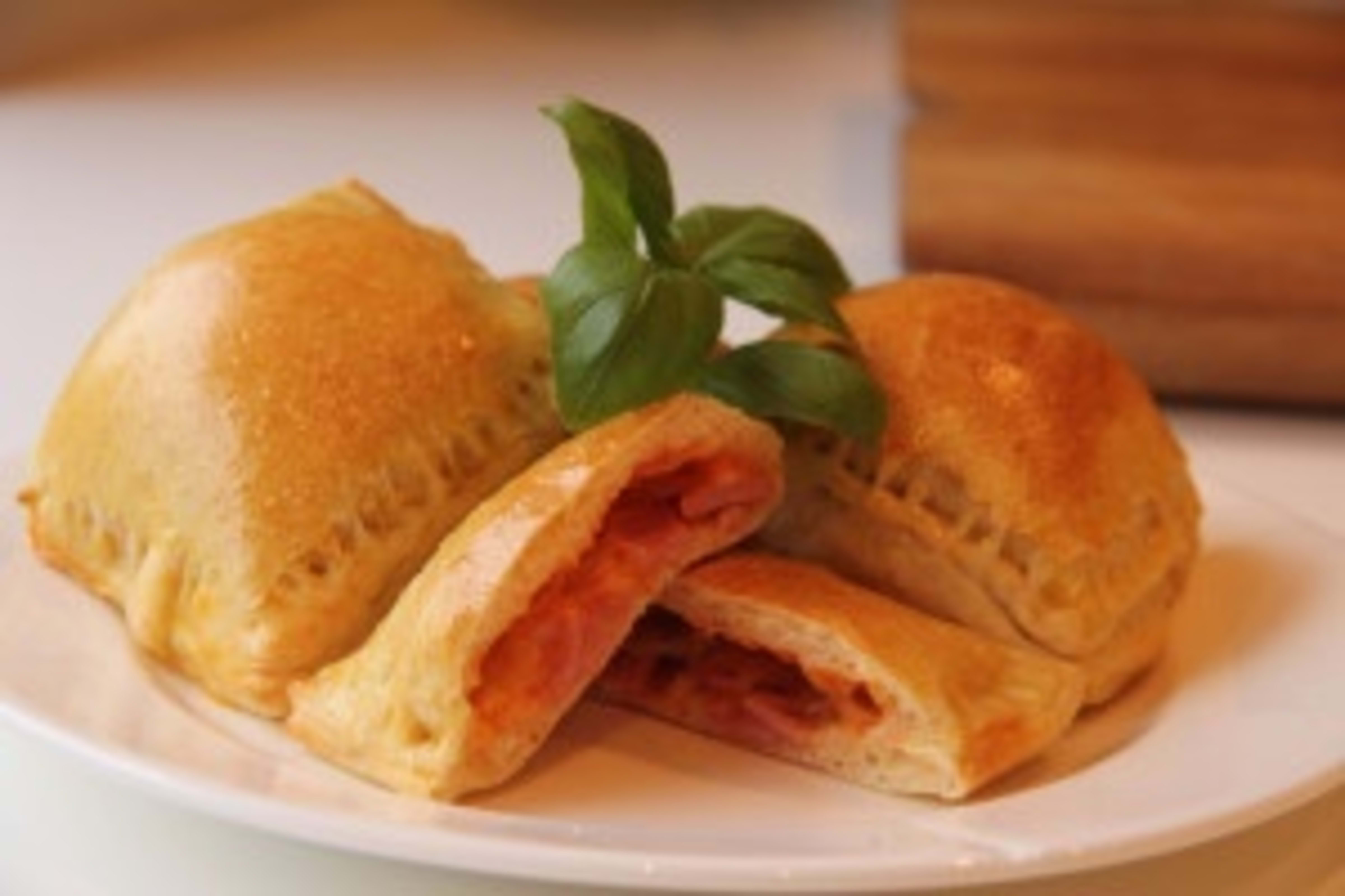 7. Smør litt tomatsaus på hvert rektangel. Ha litt skinke og ost på den ene halvdelen av rektangelet. Legg den andre halvdelen over og klem sidene godt igjen.