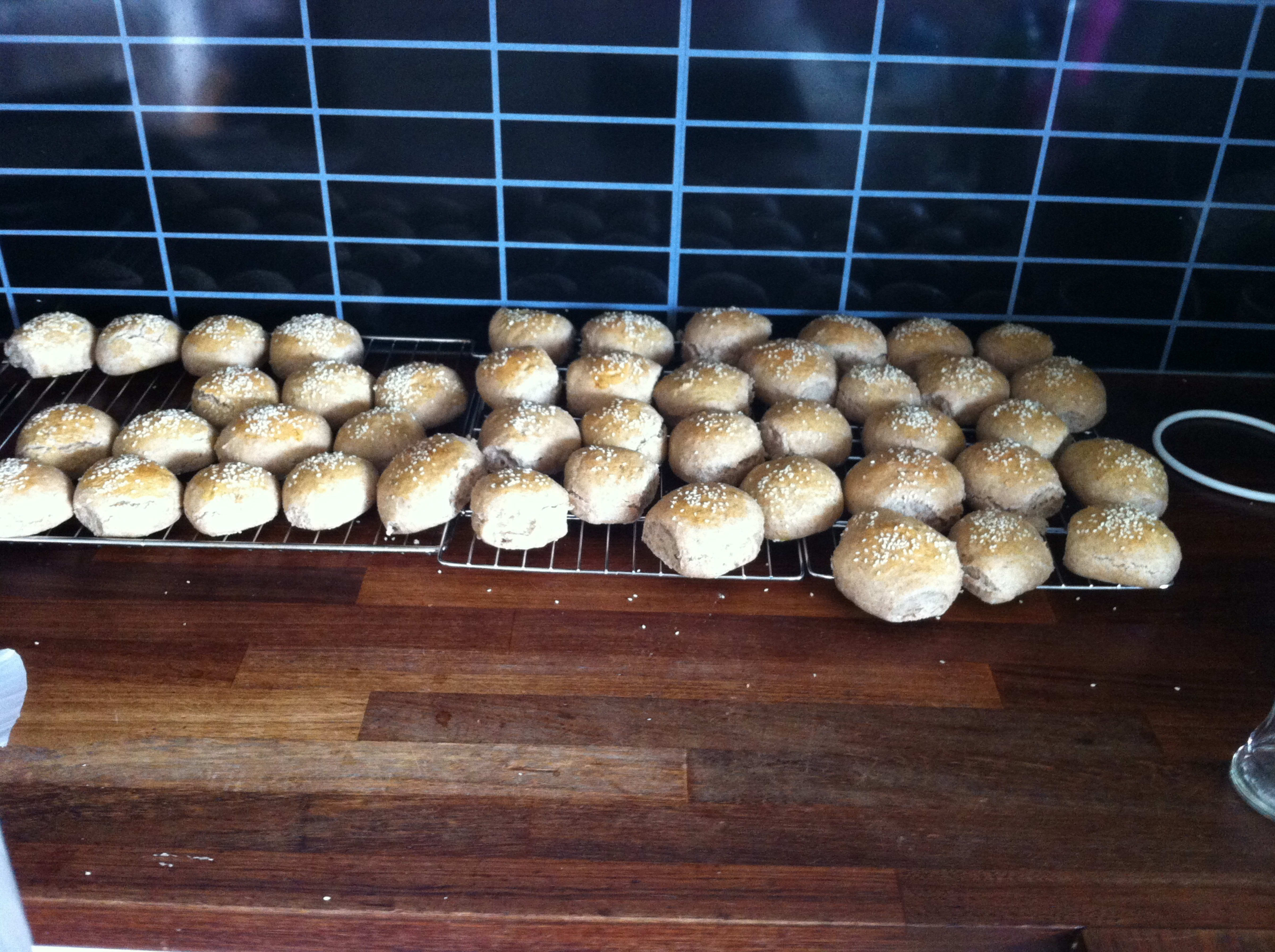 Piske 1 egg og smøre det på rundstykkene og strø sesamfrø over eller det frø du ønsker.