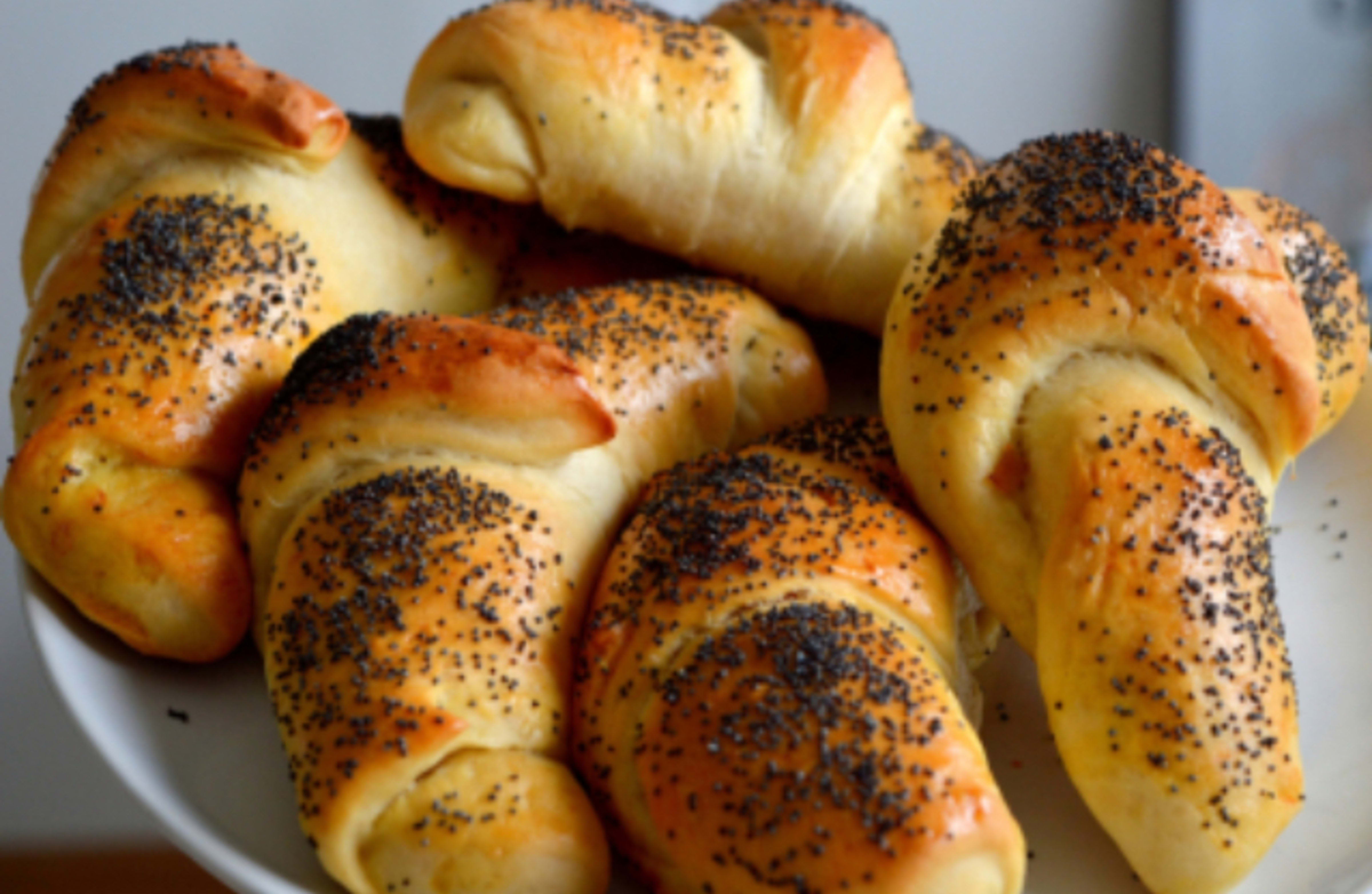 10. Pisk egg og pensle på hornene. Ha på sesamfrø, valmuefrø eller solsikkefrø over.
