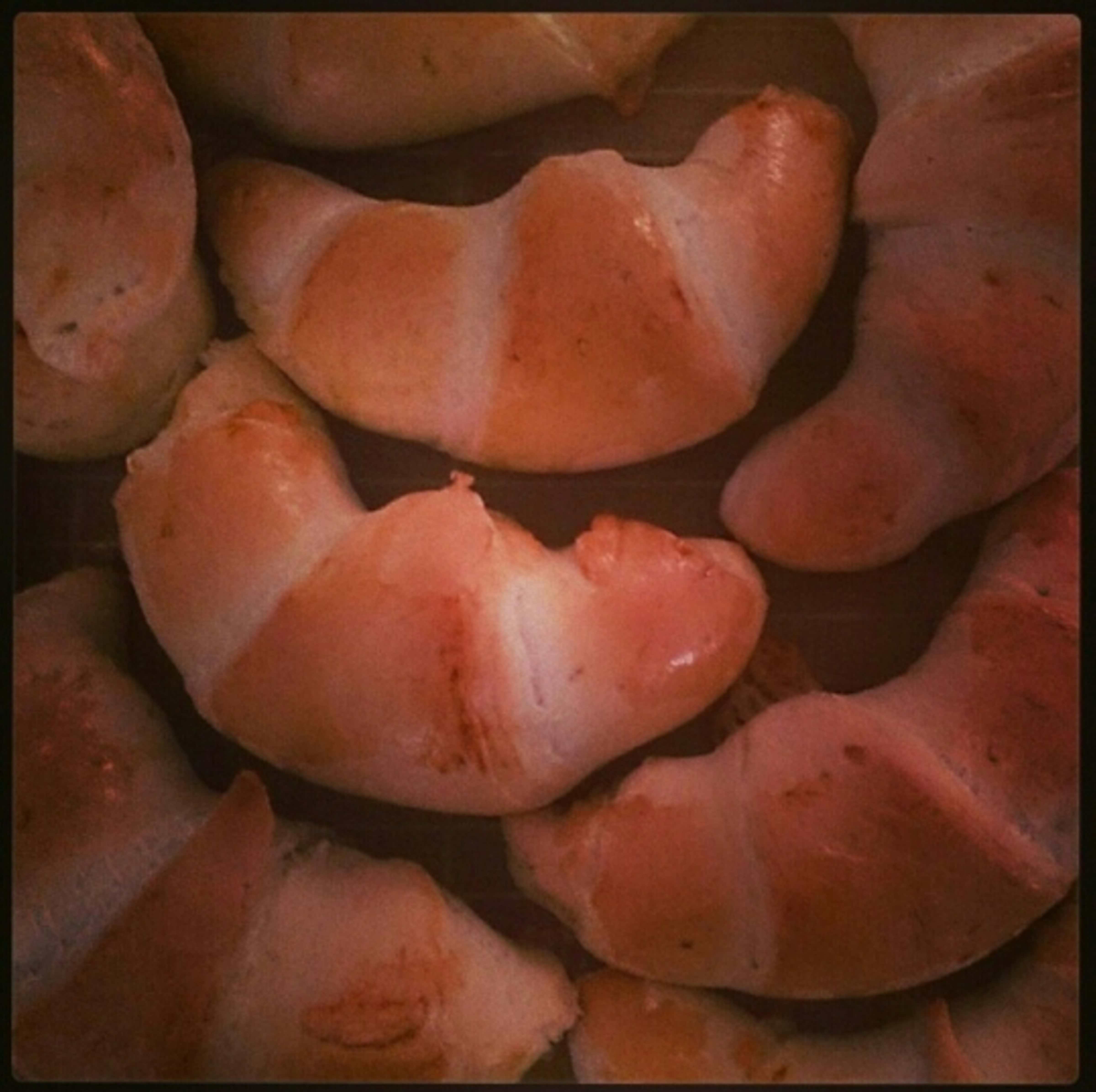 5. Legg de ferdigrullede hornene på et stekebrett og pensle. La hornene heve ca en halv time.