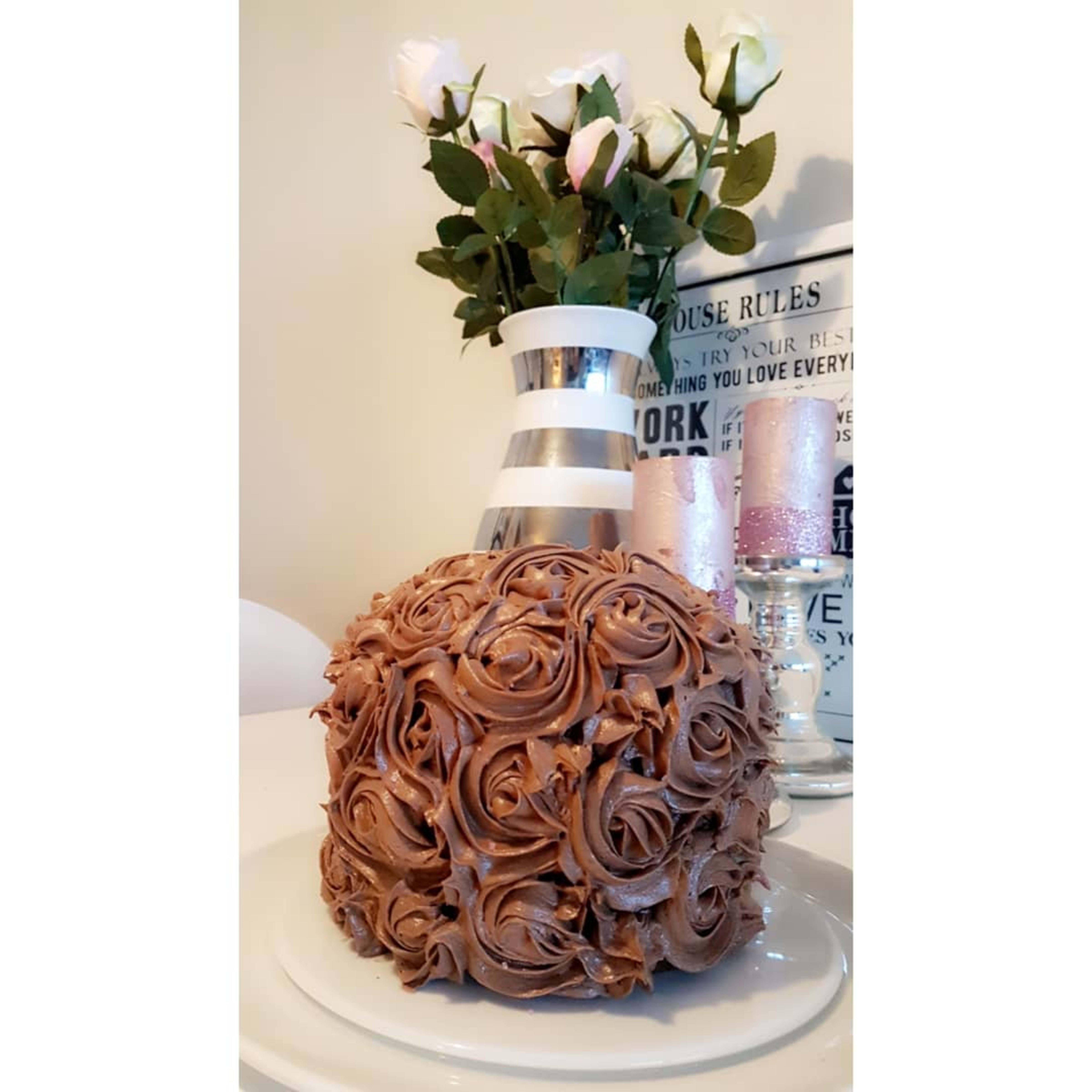 ♡Ha sjokoladefrostingen i en sprøytepose med Wilton-tip 1b eller 1m. Lag rosemønster over hele kaken, før du evt. strør frysetørket bringebærstøv eller daimkuler/bær/annen valgfri pynt over kaken.