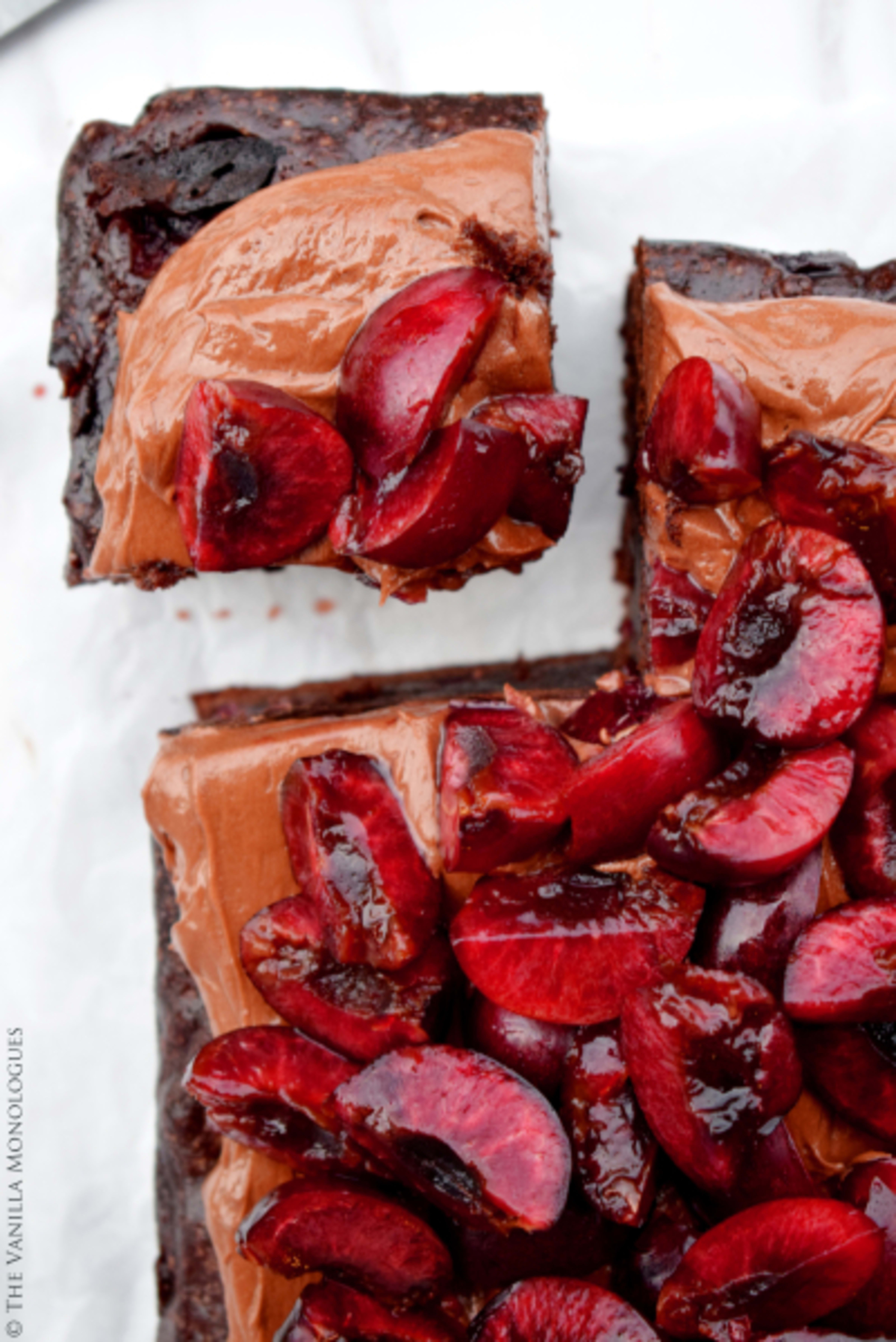 Bre over avkjølte brownies, og strø over grovhakkede moreller/kirsebær.
