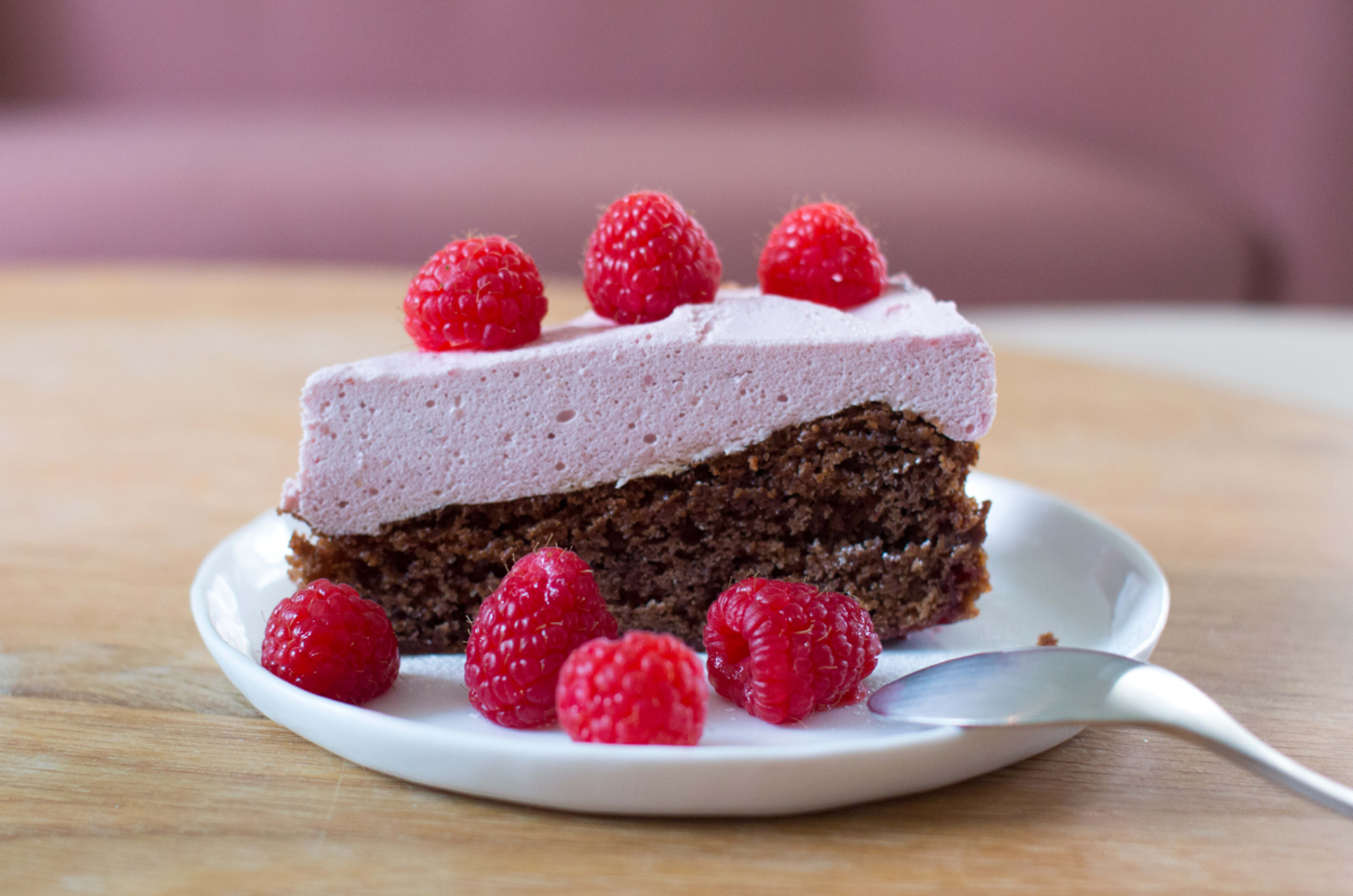 Smør eller kle en rund springform med bakepapir. Hell røren i formen og fordel den jevnt utover med en slikepott. Dryss bringebærene over og dytt de litt ned i røren. Steke brownien i midten ovnen på 200 grader i cirka 40 minutter. Blir kaken veldig mørk på toppen kan du dekke den med alumniumsfolie slik at den ikke blir brent. Kaken skal fortsatt virke myk og fuktig i midten når den er ferdig, men den skal ikke være rennende og den skal ha fått et stiv lag på toppen. Avkjøl kaken helt.