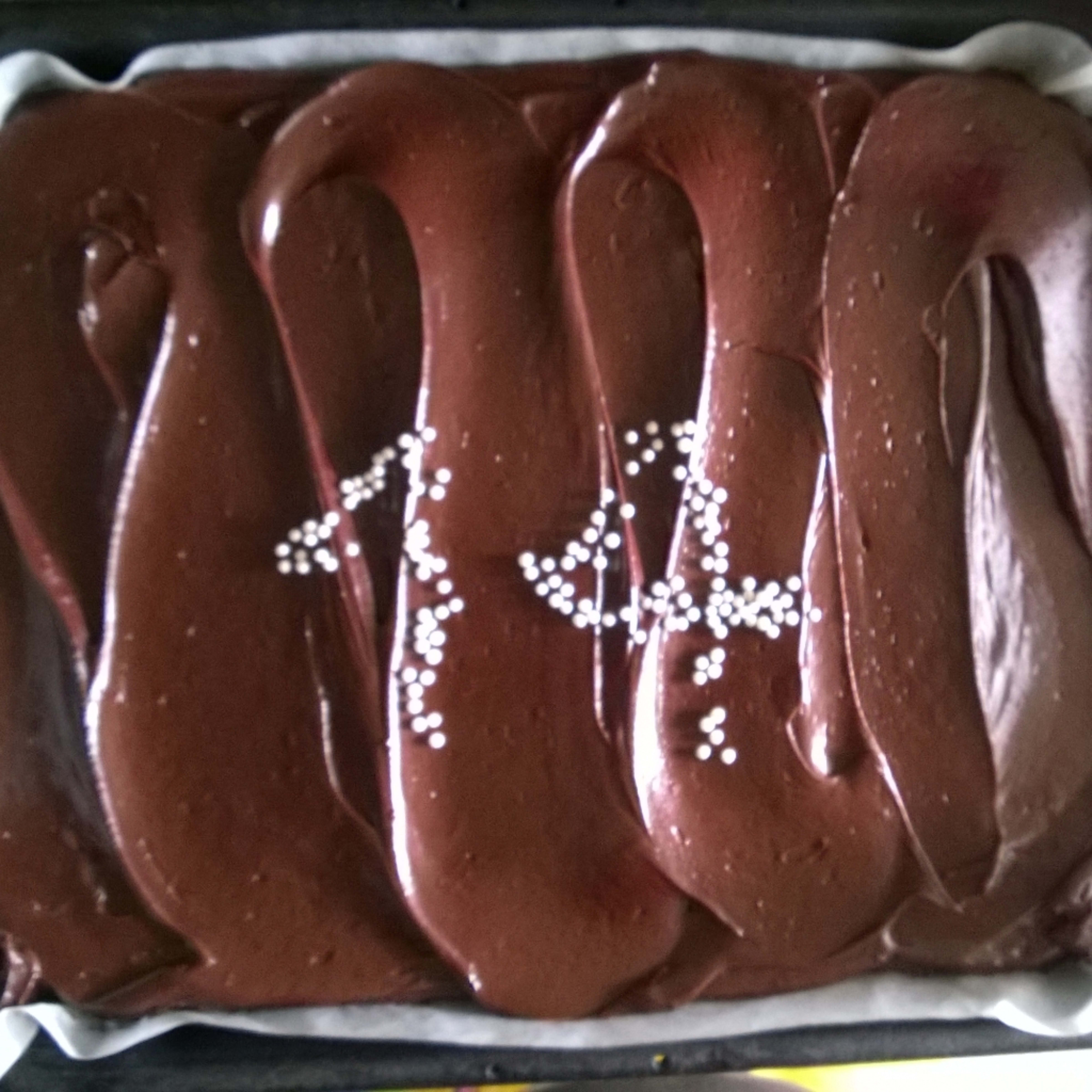 Rør alt sammen, hell i langpanne, stek på 180 C ca 35-45min. Legg glasuren på avkjølt men litt lunken kan.