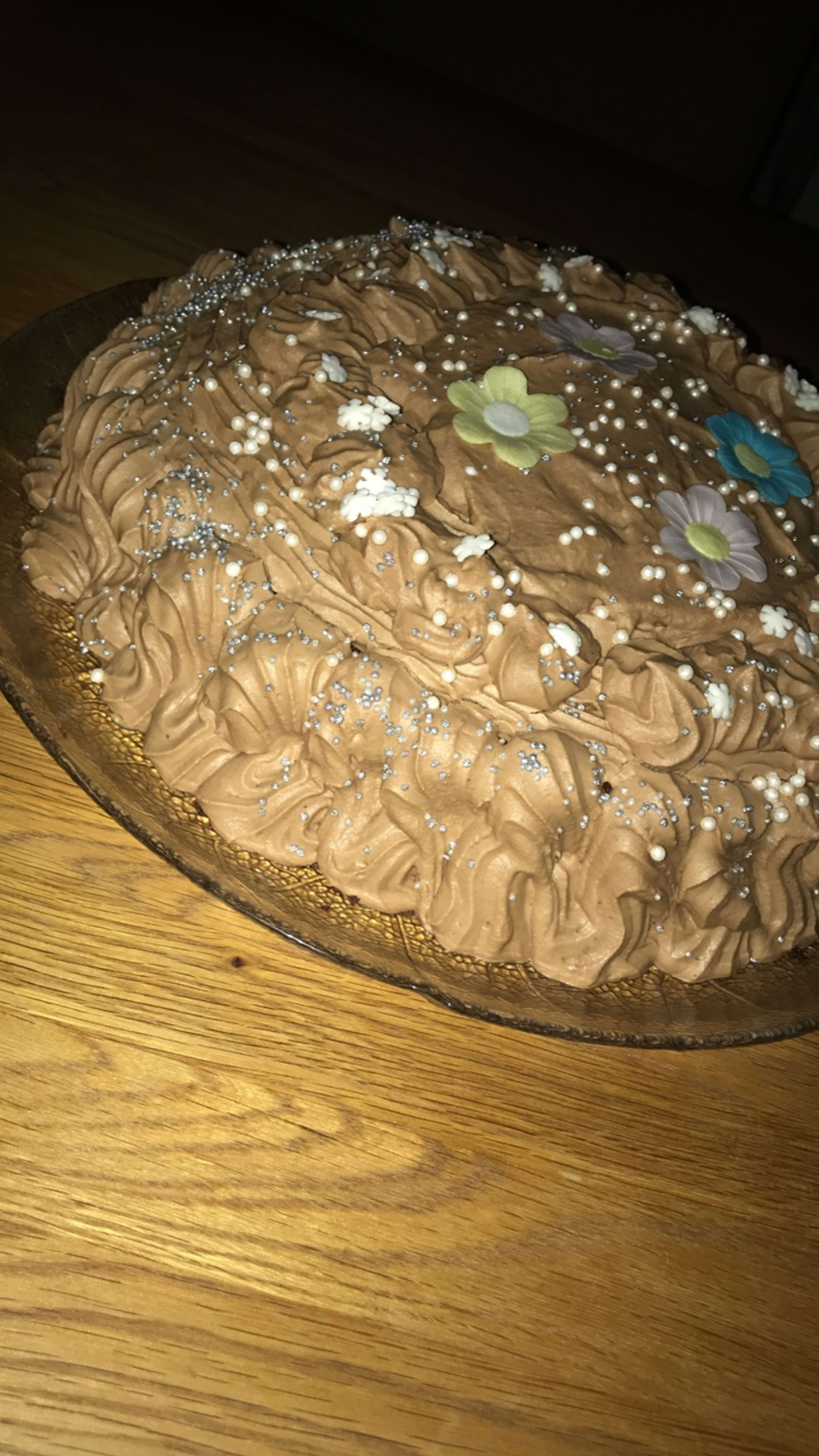 12. Når dette er gjort, fyller man en sprøytepose med sjokoladekremen og dekker hele kaken med dette. Gjerne pynt den slik man sales vil.