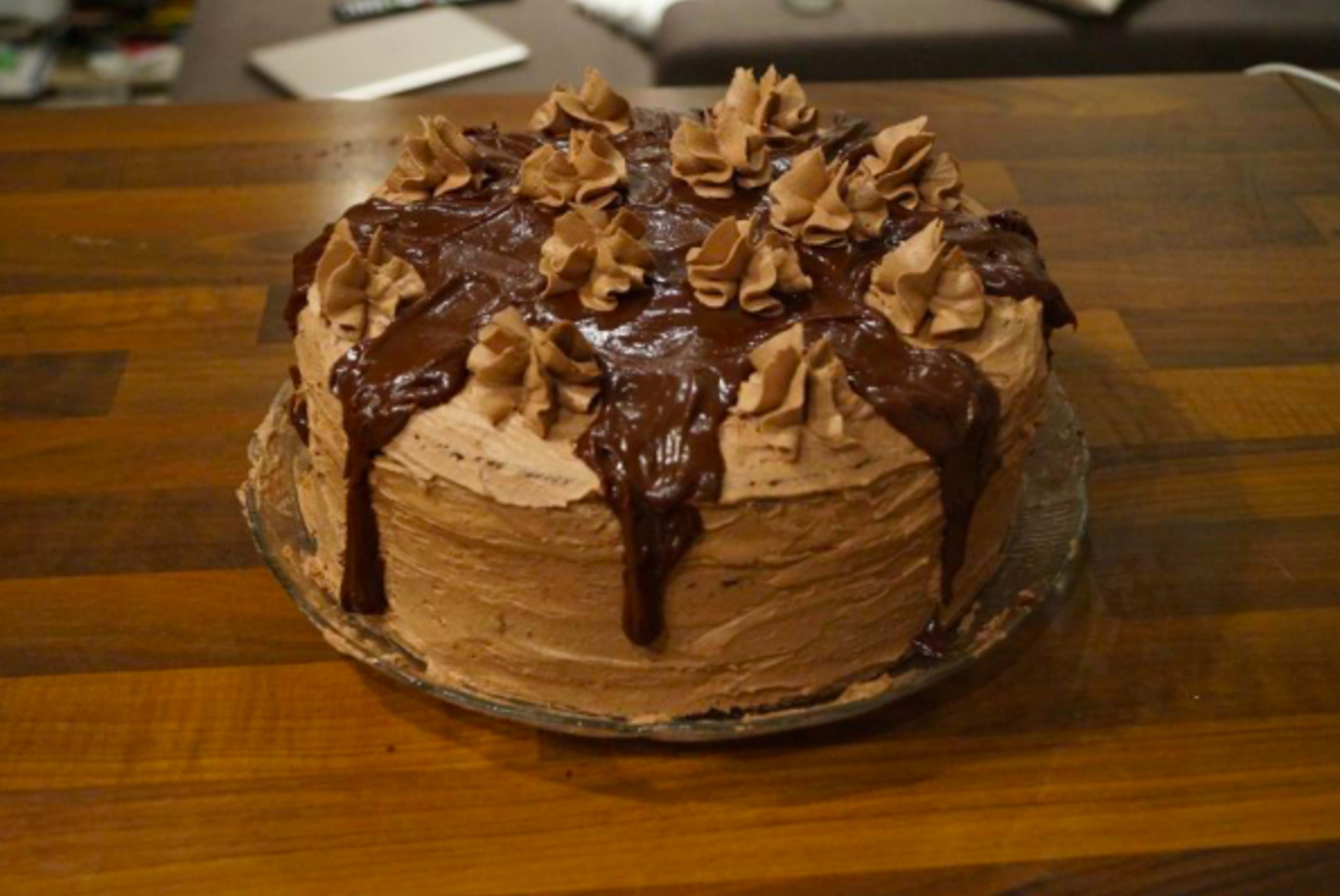 Dette blir en meget stor røre. Fordel i flere former eller en høy rundform. Stek kaken midt i ovnen på 200 grader. Test med stekepinne når kaken er ferdig, jeg har ingen tid på det.