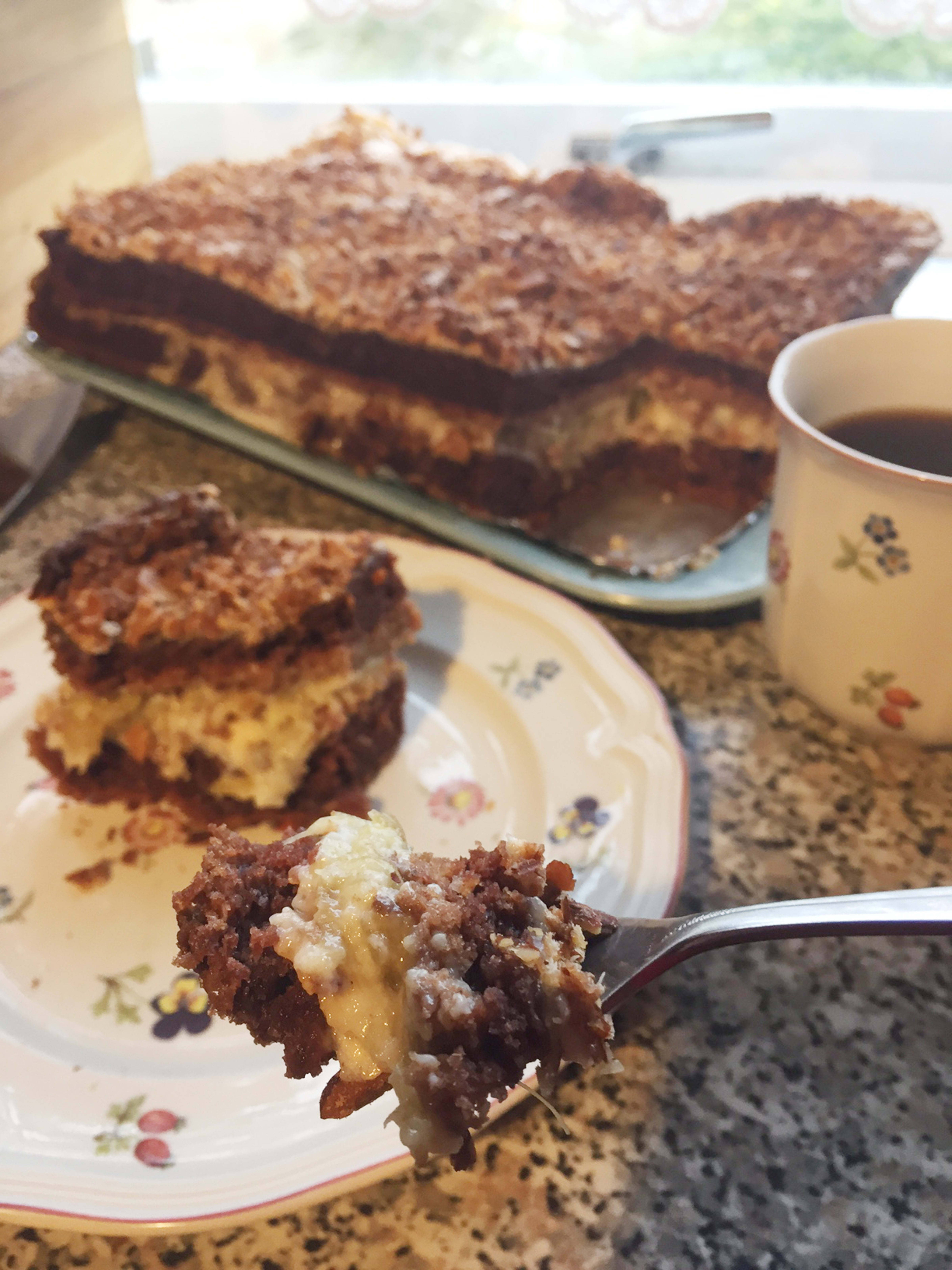 2. Sett stekeovnen på 175 oC. Bruk over og undervarme. Smelt smør og la det avkjøles litt. Bland hvetemel, sukker, kakao, natron, bakepulver og vaniljesukker i en stor bolle. Tilsett smeltet Bremykt og kefir. Rør forsiktig sammen og hell røren i langpannen.