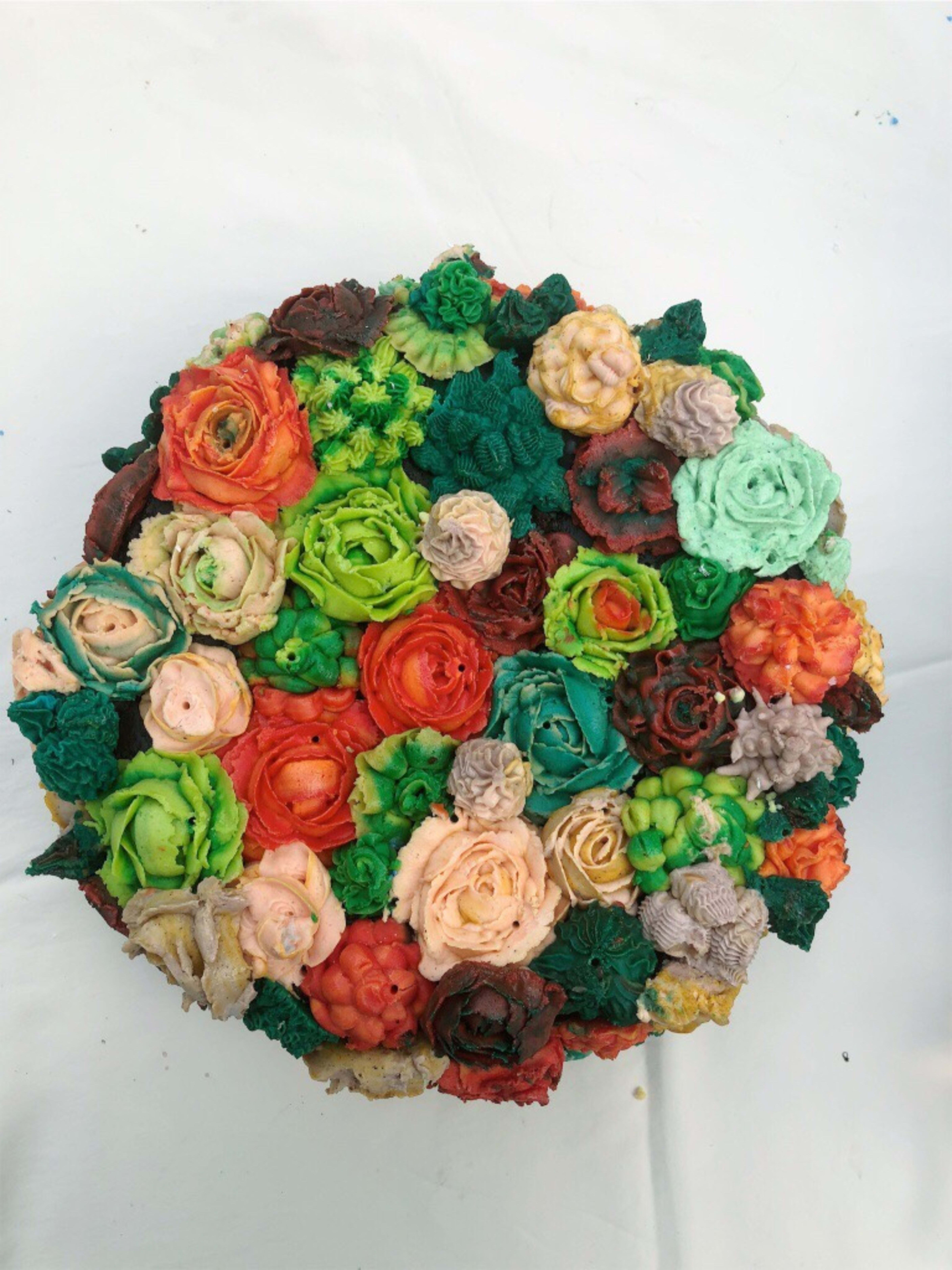 4. Ta smørkemen i en pipingbag og lag smørblomster. Evt om man ønsker en morsom effekt ta først en stripe med en farge langs kanten i pipingbaggen før du fyller resten med en annen farge. Da får man en slags ombré effekt.