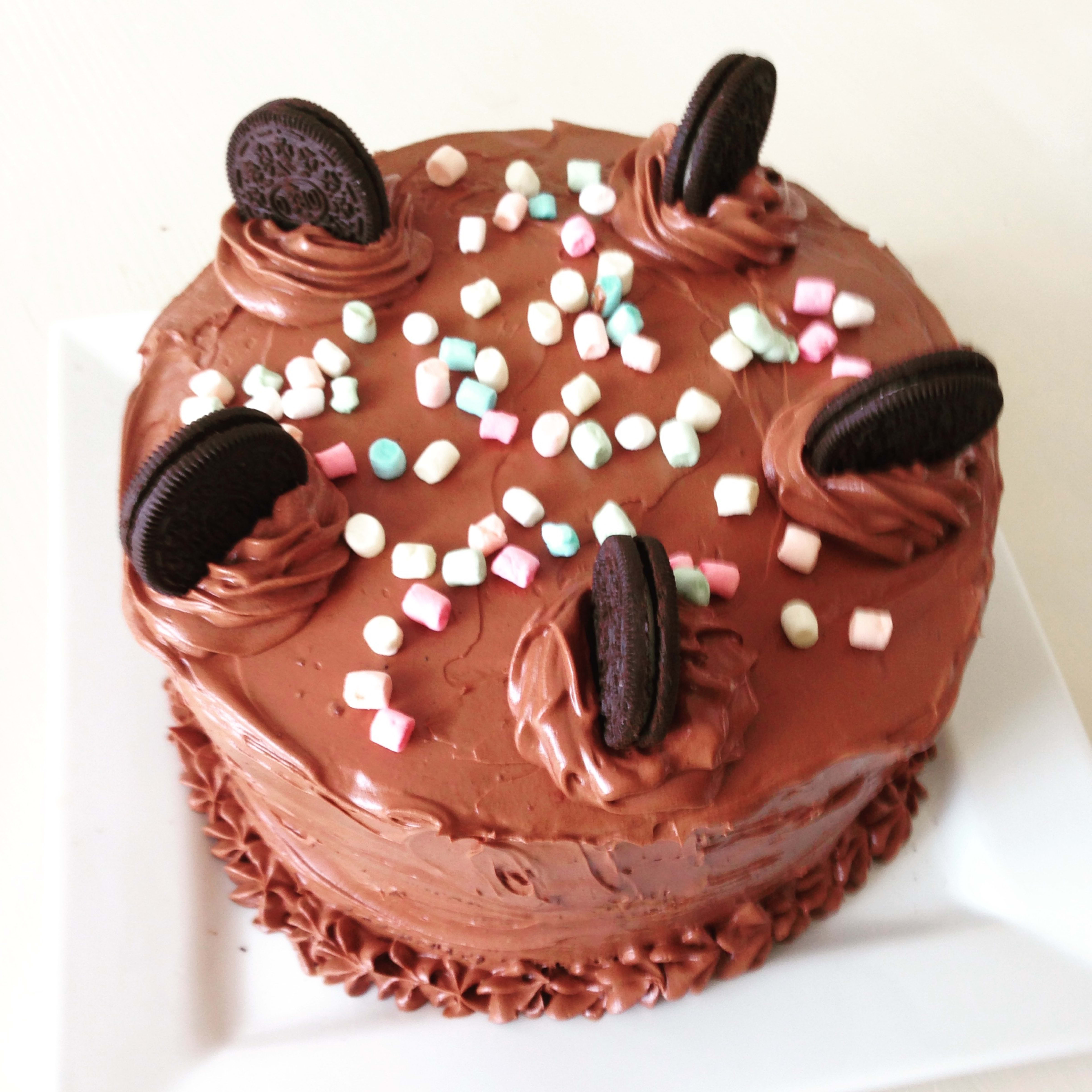 3.Bre så sjokoladefrosting på hele kaken, og sprøyt pynt slik du ønsker. Bruk gjerne halve Oreos som pynt.